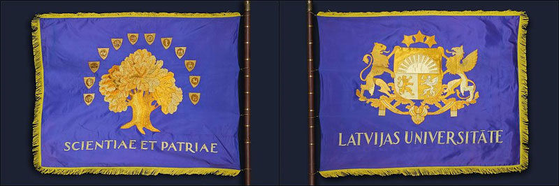 There are two golden symbols embroidered on the dark blue silk of the UL flag: on the right side – the large National Emblem of the Republic of Latvia, on the left side – the University of Latvia emblem. In the center of the university emblem, there is an oak with twelve branches. Small shields in gothic form with emblems of faculties surround the oak’s crown in a semi-circle. From the bottom, the composition is completed by the university’s slogan in Latin – Scientiae et Patriae.