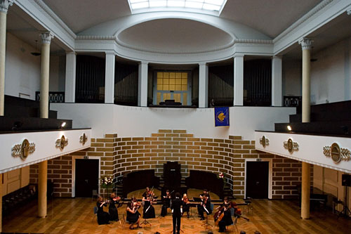 Initially the central apse of the Great Hall was decorated with sculptor Kārlis Zemdega’s (1894-1963) multi-figure composition Young Men Heading to the Source of Knowledge which reveals the themes based on the ancient art and Latvian folklore traditions. The composition was designed according to the Latin motto of the University of Latvia Scientiae et Patriae (For Science and Fatherland). These mouldings were removed after a couple of years due to criticism. In addition, the room was decorated with mouldings that symbolically represented the existing eleven Faculties of the University of Latvia – the Faculties of Architecture, Philology and Philosophy, Engineering, Chemistry, Agriculture, Mathematics and Natural Sciences, Mechanics, Medicine, Veterinary Science, Economics and Law and Theology. The twelfth moulding depicted the oak with eleven branches symbolizing all the Faculties.