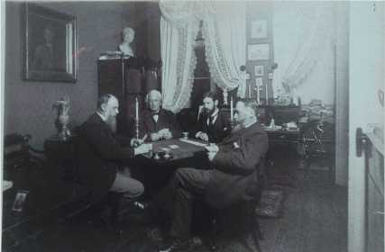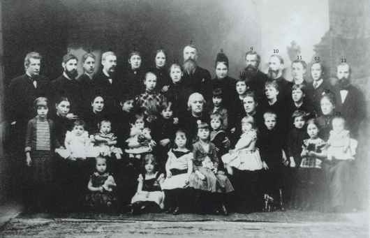 Centrālais stāvs sēžam vidū ir Eduards Holanders, viņa dēls Bernhards ir augšējā rindā otrais no kreisās puses (1889).