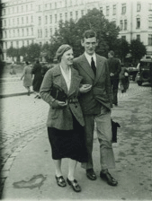 Gerda Holandere un Rolfs fon Ungerns-Šternbergs 1937. gadā Rīgā pie Brīvības pieminekļa.