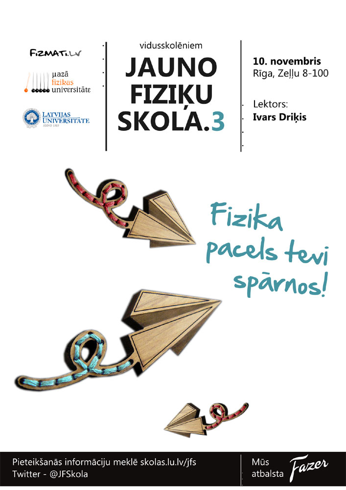Šī gada 10. novembrī Fizikas un matemātikas fakultātes telpās, Rīgā, Zeļļu ielā 8, notiks Jauno fiziķu skolas šīs sezonas trešā nodarbība - „Fizika pacels tevi spārnos!”.