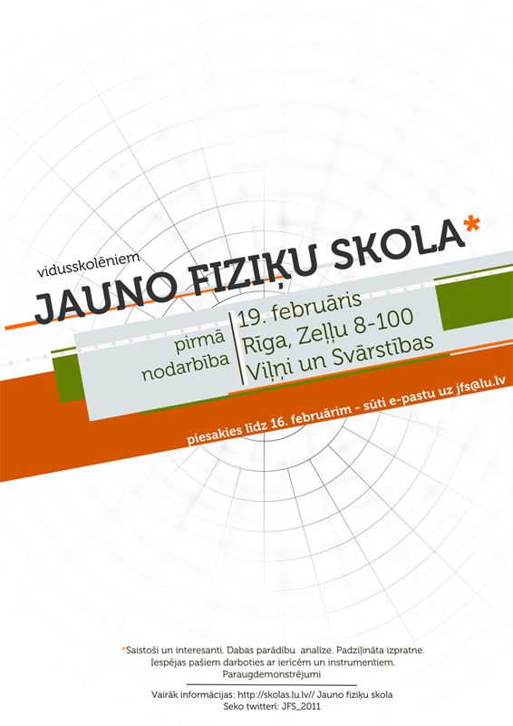 2011. gada 19.februārī darbu uzsāks LU Fizikas un matemātikas fakultātes Jauno fiziķu skola jeb JFS. JFS ar lekciju un praktisko darbu palīdzību ļaus dalībniekiem iegūtu jaunu informāciju par dažādām interesantām fizikas tēmām, dos iespēju praktiski novērot dažādas fizikālas parādības un ar fizikas studentu palīdzību analizēt tās, iegūt padziļinātu izpratni par fizikālo procesu norisi.