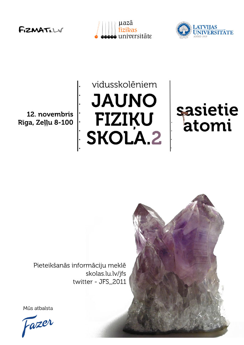Šī gada 12. novembrī Fizikas un matemātikas fakultātes (Zeļļu iela 8) telpās notiks JFS otrās sezonas trešā nodarbība ar nosaukumu „Kristāli. Sasietie atomi”.