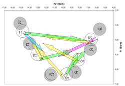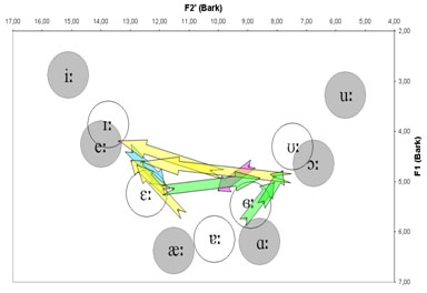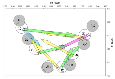 Attēlos patskaņi un divskaņi parādīti F2’/F1 psihofizikālajā plaknē. Katra attēla kreisajā pusē redzami priekšējās rindas patskaņi, labajā – pakaļējās. Ar pildītajiem pelēkajiem apļiem apzīmēti izolēti izrunāti garie patskaņi, bet ar baltajiem – garie patskaņi, kas izrunāti teikumos reālos vārdos. Ar bultiņām norādīti divskaņi. Katras bultiņas sākums atbilst attiecīgā divskaņa sākumam (pirmajam komponentam), bet beigas – divskaņa beigām (otrajam komponentam). Redzams, ka neuzsvērtajiem patskaņiem ir notikusi patskaņiem atbilstošo apļu novirze patskaņu plaknes centra virzienā, kas atbilst runas orgānu stāvokļu neitralizācijai. Līdzīgas maiņas vērojamas arī neuzsvērtajās pozīcijās izrunātu divskaņu novietojumā. Tā kā ir notikusi gan patskaņu, gan divskaņu kvalitātes maiņa, to apzīmēšanai dažādās pozīcijās būtu jāpiemēro atšķirīgi transkripcijas simboli.
