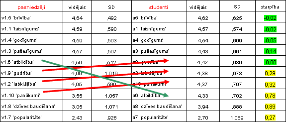 Studentu un pasniedzēju desmit vērtību hierarhijas šķiet pietiekoši līdzīgas ranžējumu nozīmē – pirmajās vietās abām grupām ir brīvība ar praktiski vienādu vidējo vērtējumu, taisnīgums, godīgums un patiesīgums (pēdējai vērtībai studentu un pasniedzēju grupā ir atšķirīgs vidējais vērtējums). Turpmāko vērtību salīdzinājumā parādās būtiskas atšķirības gan secībā (tā atbildība, ko pasniedzēji nosauc kā ceturto svarīgāko vērtību no piedāvātajām, studentu interpretācijā ir astotā ), gan vidējos vērtējumos (gudrība, labklājība un panākumi kopumā studentu vērtību hierarhijā ieņem augstāku vietu, kā pasniedzēju vērtējumos). Abām grupām kopīgs ir dzīves baudīšanas un popularitātes novietošana pēdējās vietās, kaut gan vidējie rādītāji arī šīm vērtībām studentu vērtējumi ir augstāki nekā pasniedzēju sniegtie.