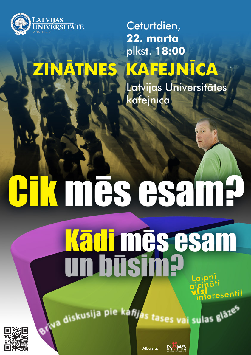 Ceturtdien, 22. martā, plkst. 18.00 Latvijas Universitātes (LU) kafejnīcā (Raiņa bulvārī 19) notiks pasākums „Zinātnes kafejnīca”. Šoreiz tas būs veltīts demogrāfijas jautājumiem un dalībnieki diskutēs par tēmu „Cik mēs esam? Kādi mēs esam un būsim?”.