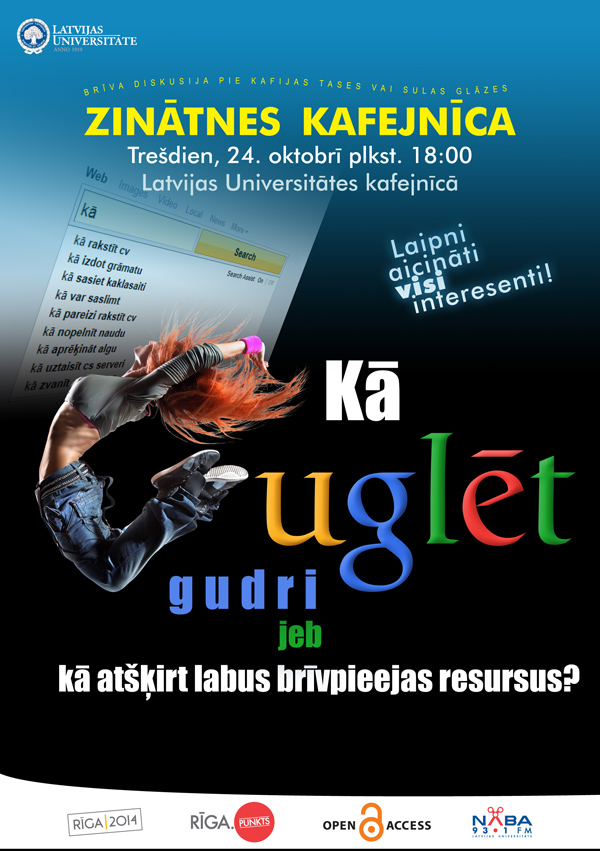 Trešdien, 24.oktobrī, plkst. 18.00 Latvijas Universitātes (LU) kafejnīcā (Raiņa bulv. 19) tiek organizēts "Zinātnes kafejnīcas" pasākums "Kā "guglēt" gudri jeb kā atšķirt labus brīvpieejas resursus?”.