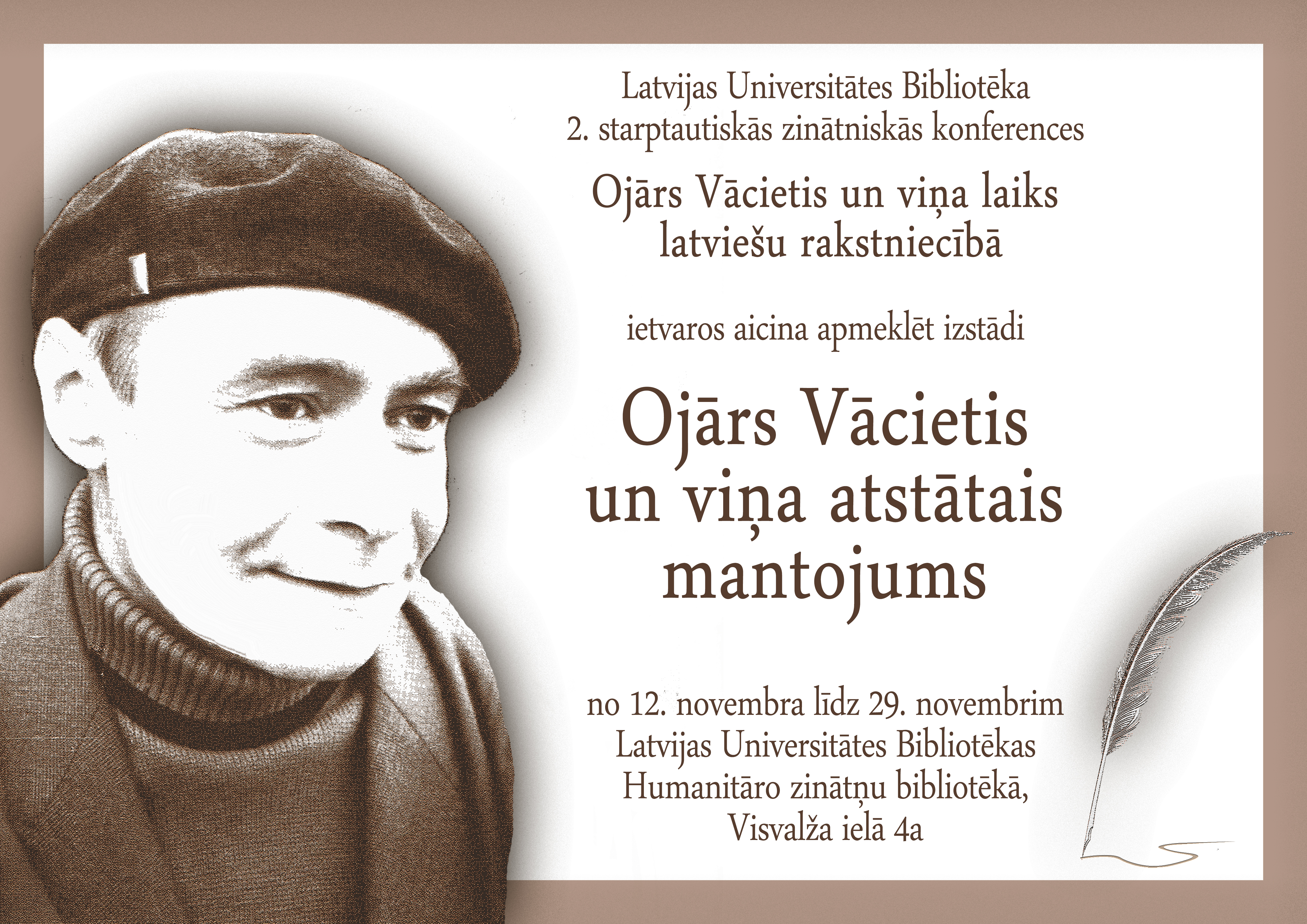 Latvijas Universitātes (LU) Bibliotēkas Humanitāro zinātņu bibliotēkā (Visvalža ielā 4a, 1.stāvā) no 12. līdz 29. novembrim būs apskatāma izstāde ”Ojārs Vācietis un viņa atstātais mantojums”.