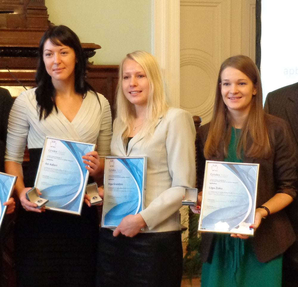 Apbalvoto jauno zinātnieku vidū ir arī trīs 2012. gada Latvijas Universitātes (LU) Ķīmijas fakultātes Ķīmijas maģistra studiju programmas absolventes. Līga Žūka saņēma balvu par darbu „Katjonu amfifilu beta-enaminoesteru atvasinājumu sintēze un īpašības” (darba vadītāji: ķīmijas doktore B. Vīgante, profesors A. Zicmanis). Aiga Grandāne saņēma balvu par darbu „6-Aizvietotu 1,2-benzoksatiīn-2,2-dioksīda atvasinājumu sintēze” (darba vadītājs: doktors R.Žalubovskis) un Ilze Adlere – par darbu „1,4-Dihidropiridīna gredzenu saturošu kondensētu heterociklu sintēze un enantiosadalīšana” (darba vadītāji: ķīmijas doktors Aivars Krauze, profesors Andris Zicmanis).