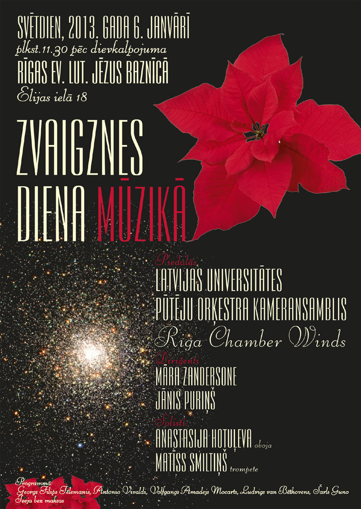 2013. gada 6.janvārī Rīgas Jēzus baznīcā, Elijas ielā 18 pēc dievkalpojuma (ap 11.30) notiks Latvijas Universitātes pūtēju orķestra kameransambļa "Riga Chamber Winds" koncerts "Zvaigznes diena mūzikā".