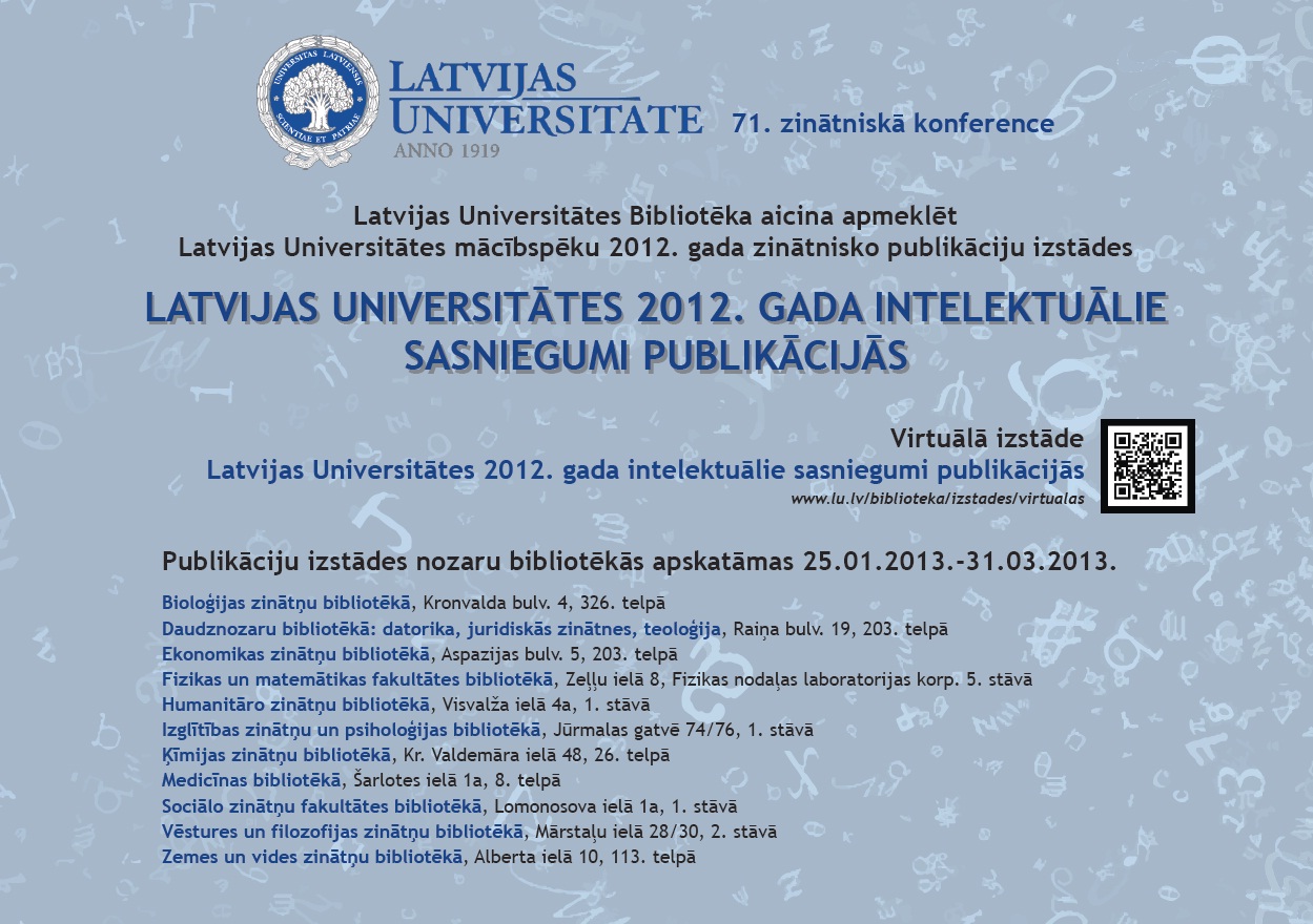 Latvijas Universitātes (LU) 71. zinātniskās konferences ietvaros LU Bibliotēka no 25. janvāra aicina iepazīties ar LU mācībspēku un zinātnieku 2012. gadā izdotajām zinātniskajām publikācijām, kas apkopotas un aplūkojamas izstādēs visās LU Bibliotēkas nozaru bibliotēkās un virtuālajā izstādē LU portāla sadaļā Bibliotēka.