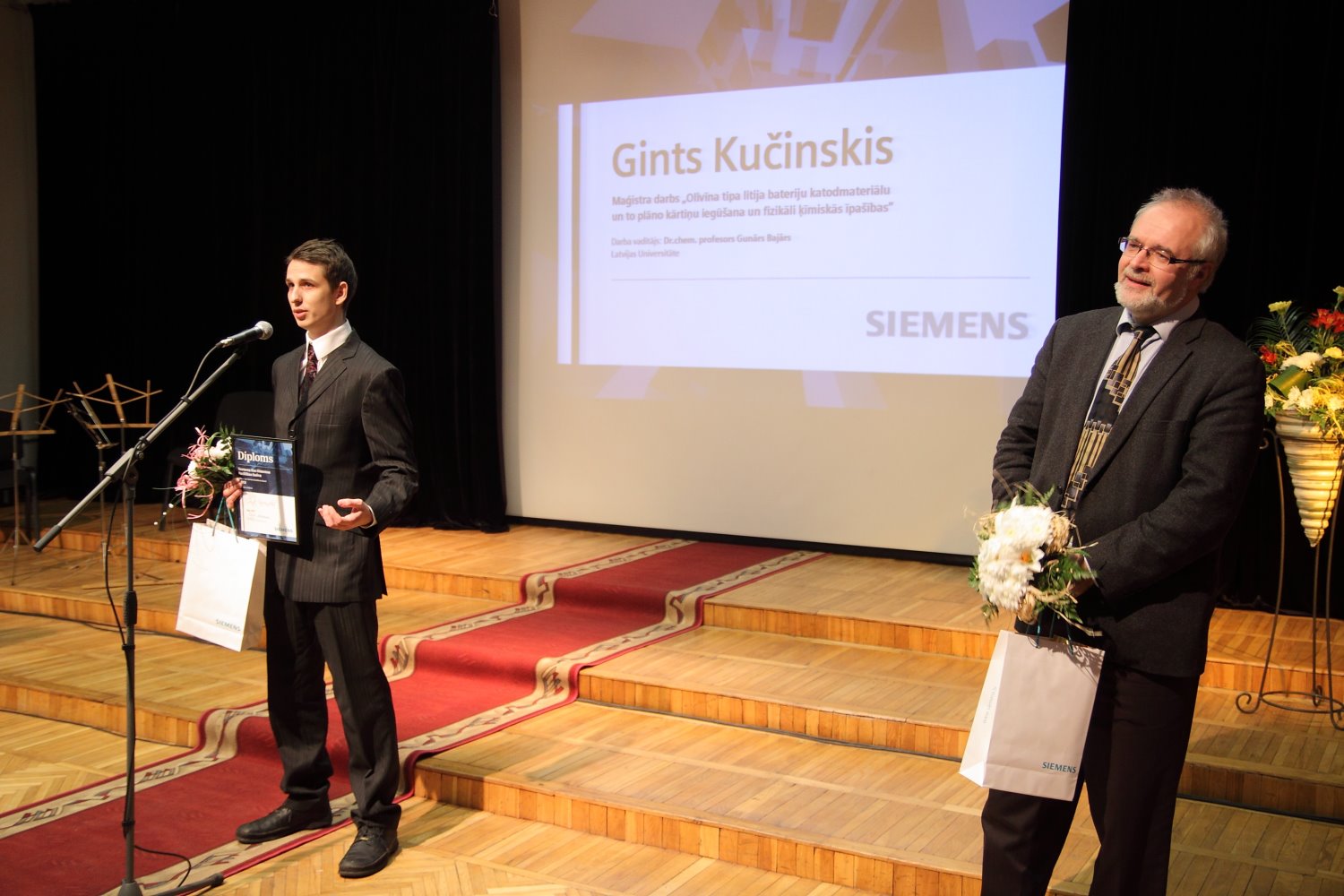 Gints Kučinskis balvu saņēma par darbu fizikā „Olivīna tipa litija bateriju katodmateriālu un to plāno kārtiņu iegūšana un fizikāli ķīmiskās īpašības” (vadītājs Dr.chem. Gunārs Bajārs), bet Elīna Kalniņa par darbu datorzinātnē „Modeļu transformāciju izstrāde, izmantojot valodu MOLA, attēlojumus un valodu Template MOLA” (vadītājs Audris Kalniņš).