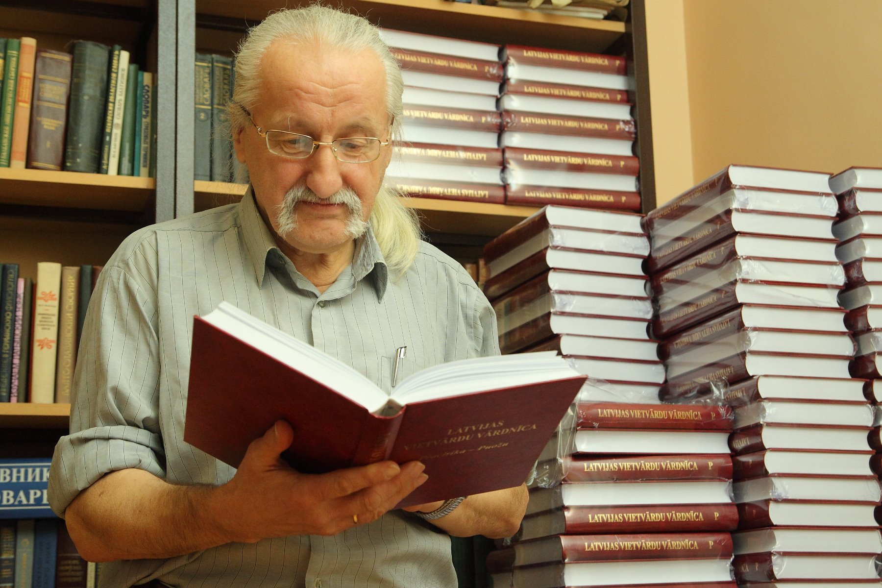 Zāles stūrī atrodas 500 Latvijas vietvārdu vārdnīcas "P burta" 3. sējuma izdevumi, iespiesti tumši sarkanos vākos. Viens eksemplārs turpmāk būs arī manā plauktā, līdzās Ojāra Buša dāvinātajai grāmatai „No ģermānismiem līdz superlatīvam”.
