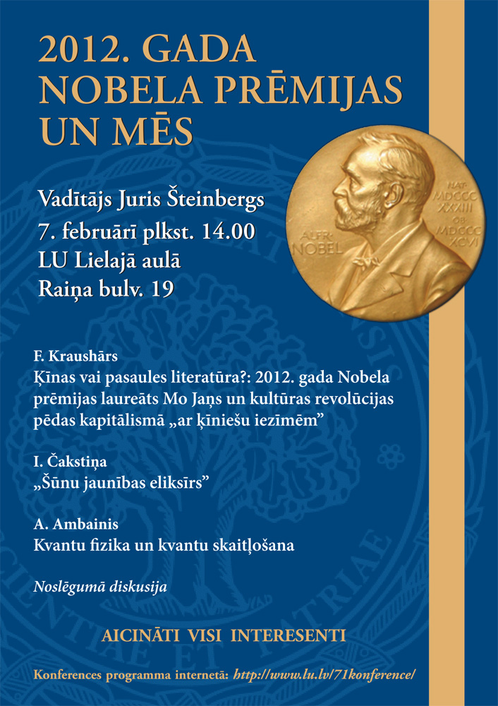 7.februārī plkst. 14.00 Raiņa bulv. 19, Lielajā aulā, notiks viena no Latvijas Universitātes (LU) 71.konferences plenārsēdēm "2012. gada Nobela prēmijas literatūrā, medicīnā, fizikā un mēs". Visi laipni aicināti!