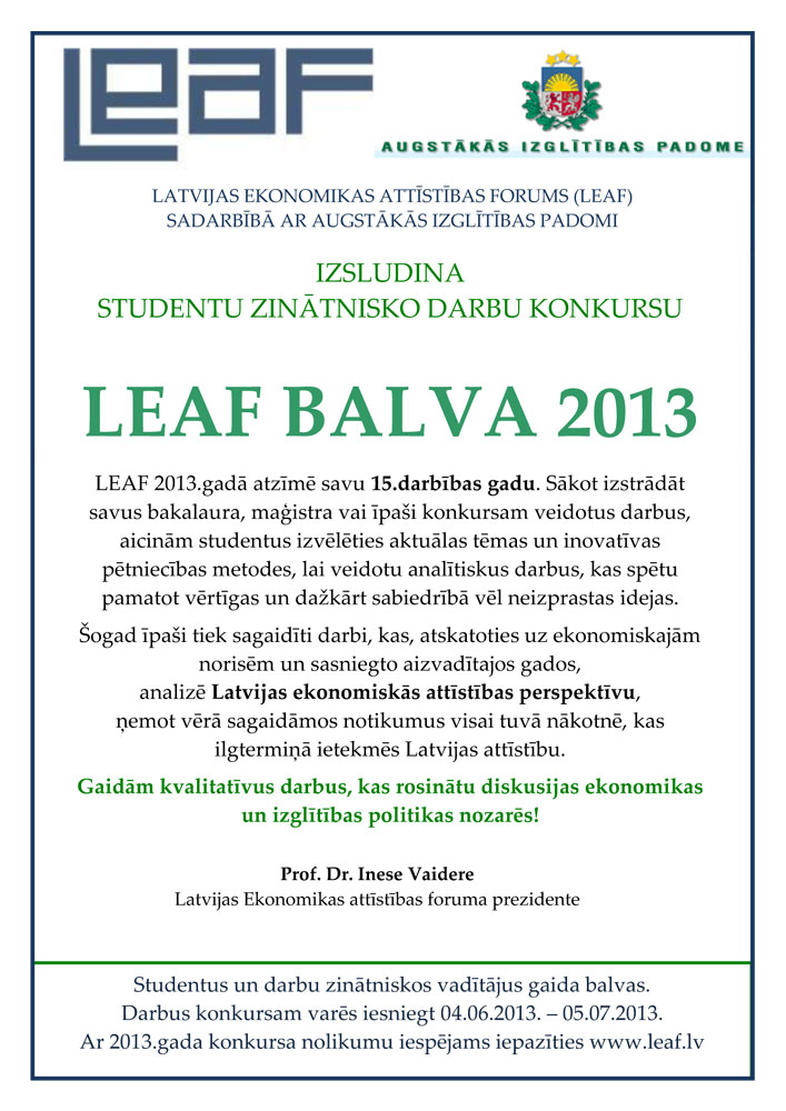 Latvijas Ekonomikas attīstības forums (LEAF) sadarbībā ar Augstākās izglītības padomi izsludina studentu zinātnisko darbu konkursu "LEAF balva 2013".