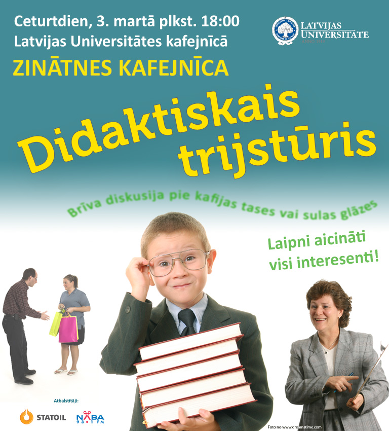Ceturtdien, 2011.gada 3.martā, plkst. 18.00 Latvijas Universitātes kafejnīcā (Raiņa bulv. 19) notiks „Zinātnes kafejnīcas” pasākums. Šoreiz tas būs veltīts pedagoģijai un sauksies „Didaktiskais trijstūris”.