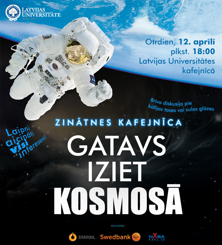 Otrdien, 12. aprīlī plkst. 18.00 Latvijas Universitātes kafejnīcā tiek organizēts "Zinātnes kafejnīcas" pasākums. Šoreiz tas būs veltīts Jurija Gagarina lidojuma 50 gadu jubilejai un sauksies ”Gatavs iziet kosmosā”. Pasākums tiešraidē būs skatāms LU portālā.