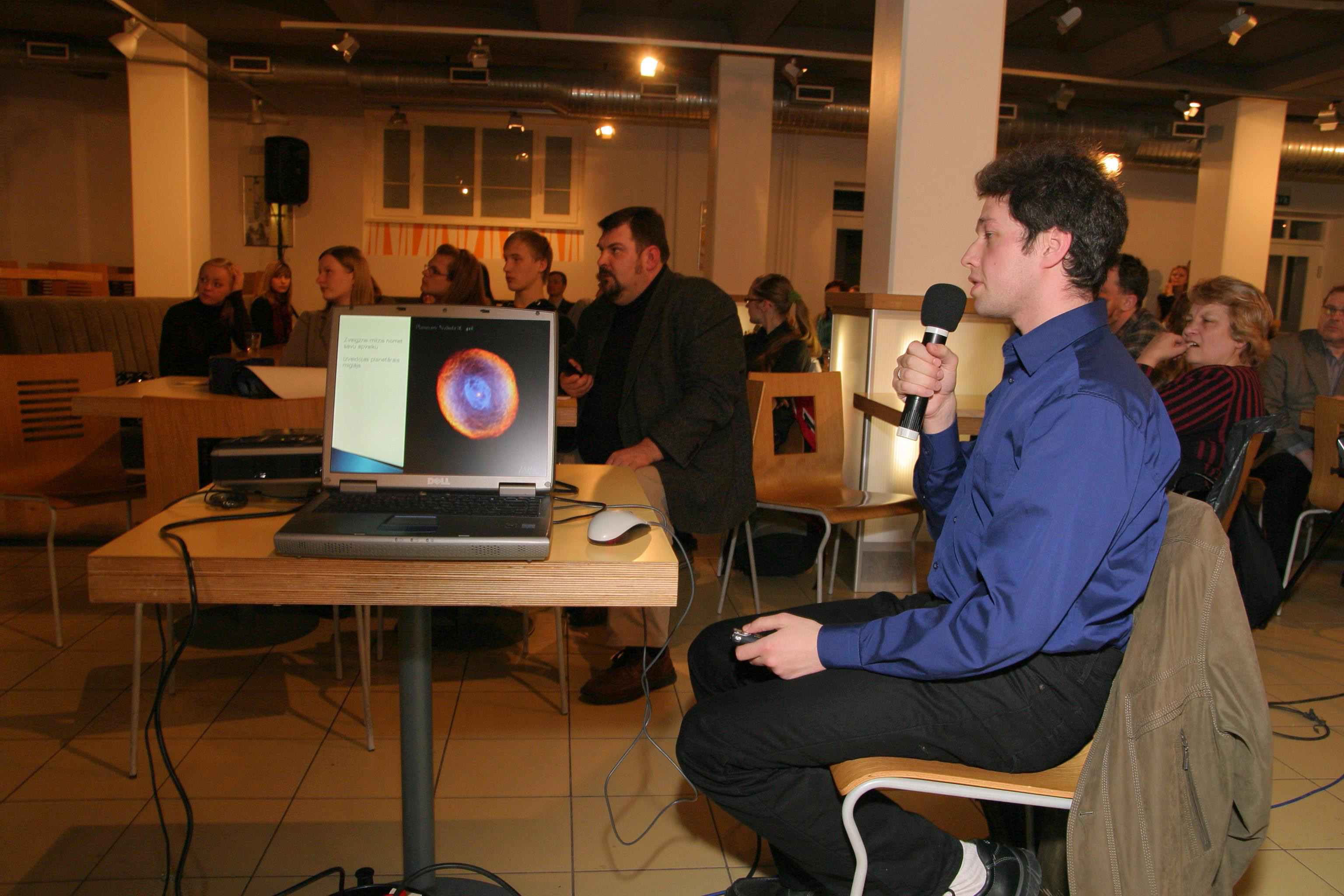 LU Astronomijas institūta pētnieks Dr. Dmitrijs Docenko stāstīja par zvaigznes dzīves pusmūžu – planetārajiem miglājiem, pārnovu uzliesmojumiem, neitronzvaigznēm un melniem caurumiem. Planetāro miglāju centrā atrodas zvaigzne, kuru sauc par balto punduri. Tas sastāv no oglekļa un ir ļoti blīvs. Tātad planetāro miglāju centrā atrodas milzīgi dimanti, droši vien tie ir vislielākie dimanti Visumā. Zvaigžņu beigu stadijas ir atšķirīgas – no mazākas formas zvaigznēm veidojas baltie punduri, lielākas formas zvaigznes uzsprāgst kā pārnovas.