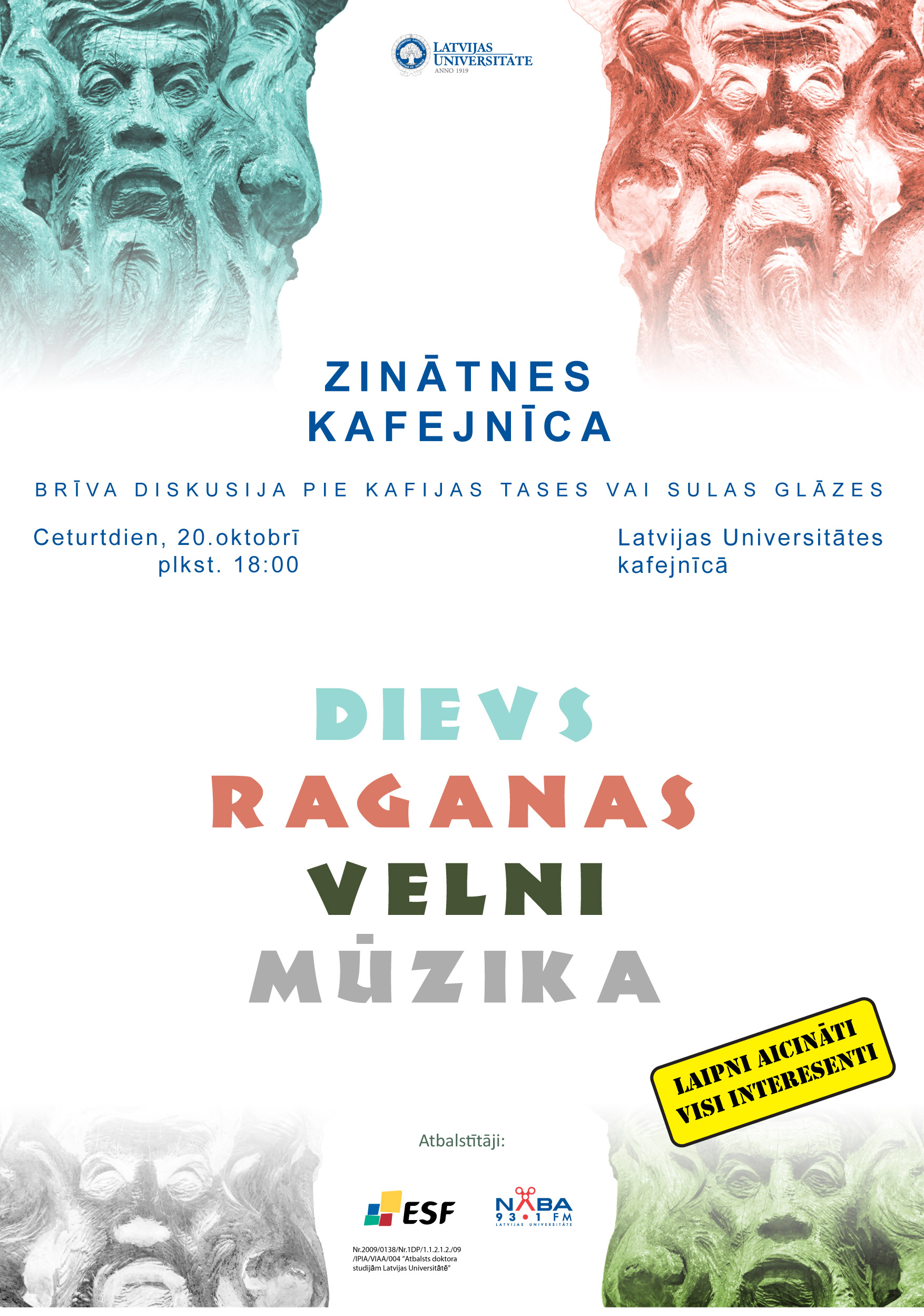 Ceturtdien, 20. oktobrī, plkst. 18.00 Latvijas Universitātes kafejnīcā (Raiņa bulvārī 19) notiks pasākums „Zinātnes kafejnīca”. Šoreiz tas būs veltīts jauno zinātnieku pētījumiem par dažādiem simboliem un tēmai „Dievs, raganas, velni un mūzika”.