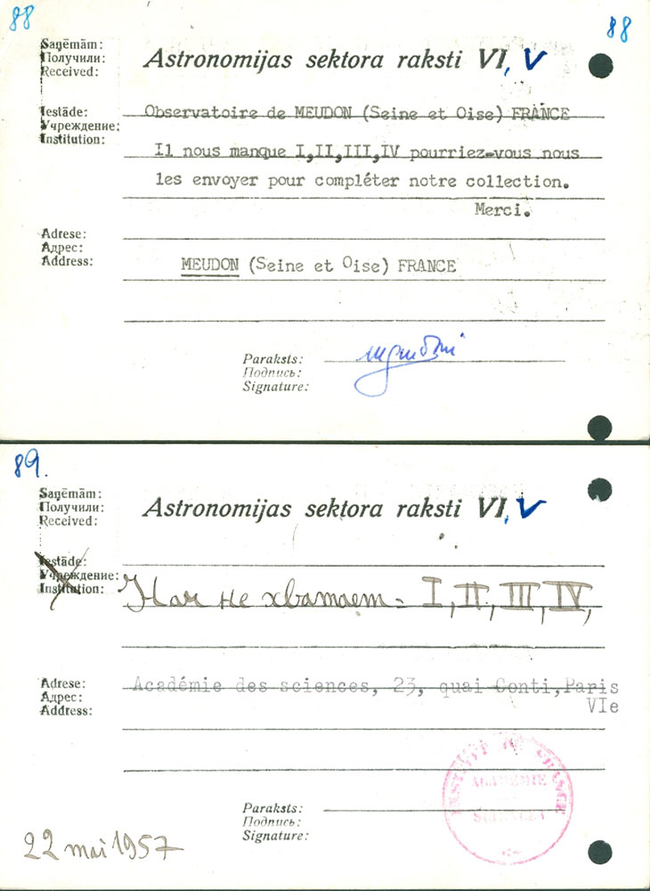 Saglabājusies arī kartotēka, kas satur informāciju par iepriekšējo gadu ZA observatorijas sadarbības partneriem. Padomju periodā sadarbība notikusi ar 277 iestādēm 45 pasaules valstīs. Iepirkumus no ārvalstīm bija iespējams veikt tikai par valūtu, un, kā jau tajos laikos, sarakste ar ārzemju partneriem stingri tika kontrolēta. PSRS Zinātņu akadēmijas Astronomijas padome piešķīra valūtu tikai astronomisko plašu iegādei. Zinātniskās literatūras pasūtīšanu veica Latvijas ZA Fundamentālā bibliotēka. Šis bagātais materiālu klāsts joprojām daļēji glabājas Riekstukalnā.
