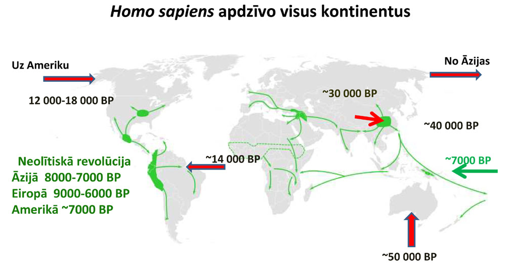 Viss ģenētiskais un kultūras mantojums modernajā cilvēkā pamatā nāk no Homo sapiens, kaut arī neandertālieši izgatavoja darbarīkus un veidoja mākslas priekšmetus. Pirms aptuveni 100 000 gadu Homo sapiens atstāja Āfriku un vairāku desmitūkstošu gadu ilgajā periodā sāka apdzīvot visus kontinentus (2. att.). Visvecākās Homo sapiens atradnes atrastas Austrālijā (vecums ap 50 000 gadu) un beidzamais kontinents, kuru Homo apguva no Āzijas pa Beringa jūras šaurumu (tai laikā tas bija sauss vai klāts ar ledu), bija Amerika. Ģenētika pierāda, ka visu kontinentu iedzīvotājiem ir radniecīgi gēni un kopīgi senči Āfrikā.