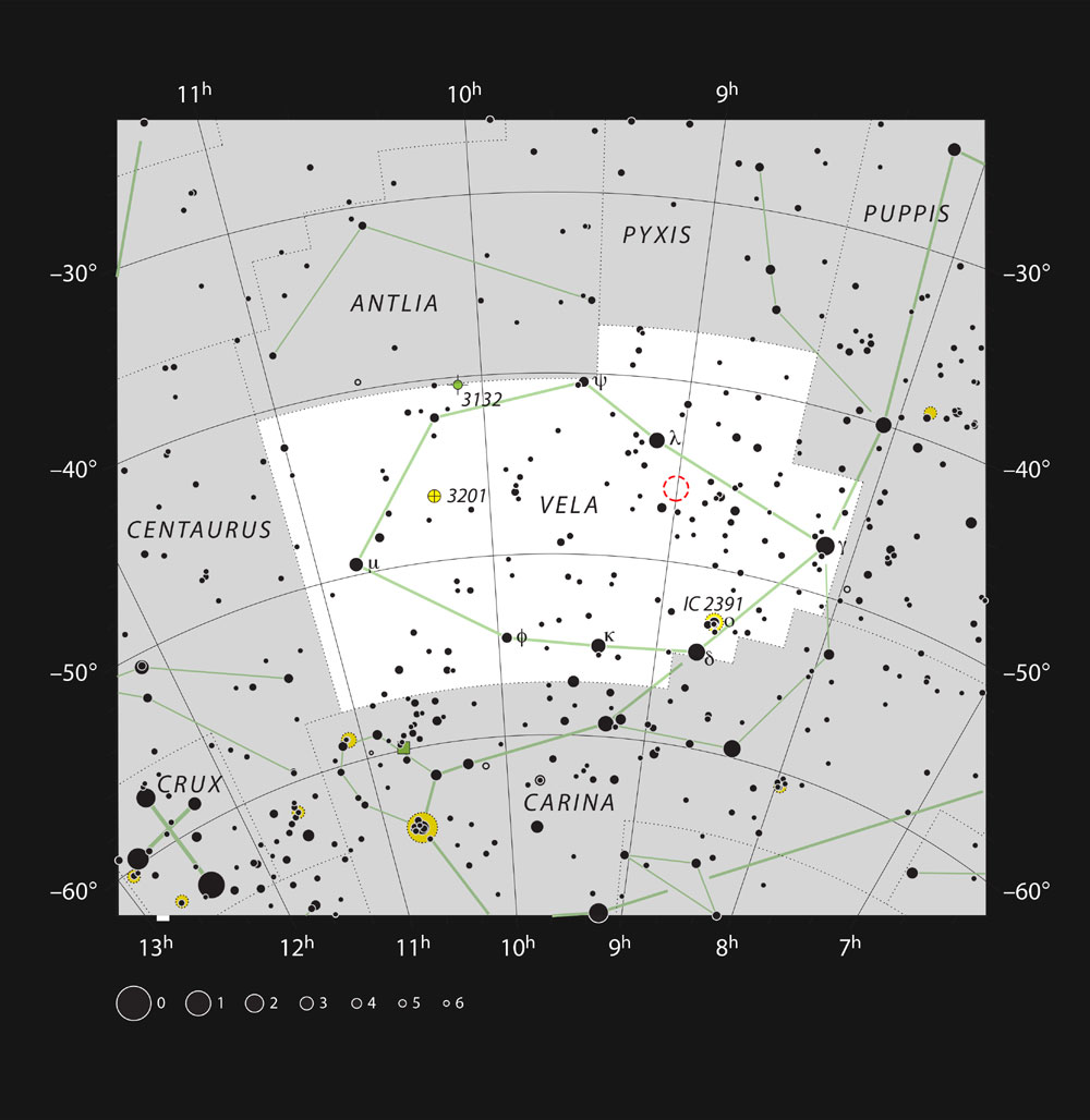 - 3. att. Karte rāda Zīmuļa miglāja (NGC 2736, 800 gaismas gadu attālumā) vietu (iezīmēts ar sarkanu aplīti) Buru zvaigznājā dienvidu puslodē.