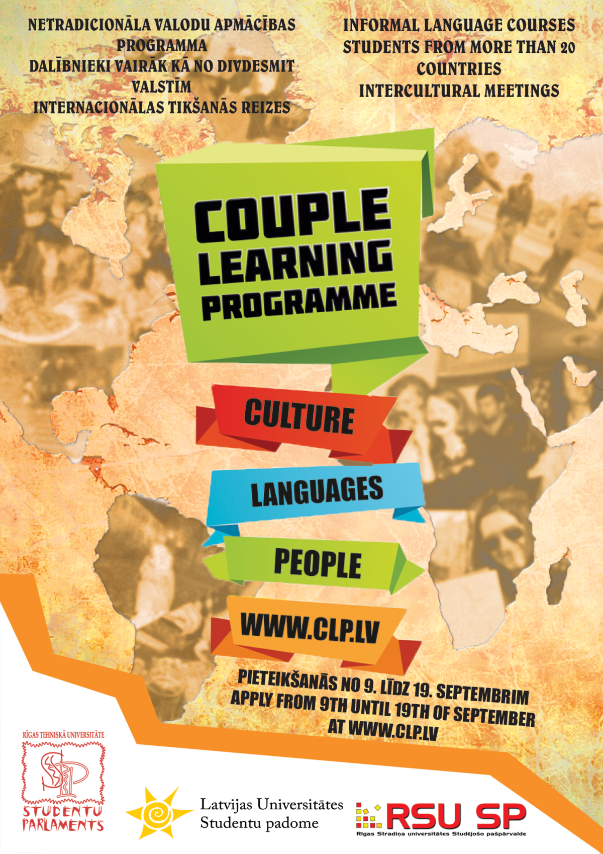 If you want to expand your language skills, to get international contacts and to have a fantastic time together with great people, then join Couple Learning Programme until 19th of September 23:59. Registration at www.clp.lv