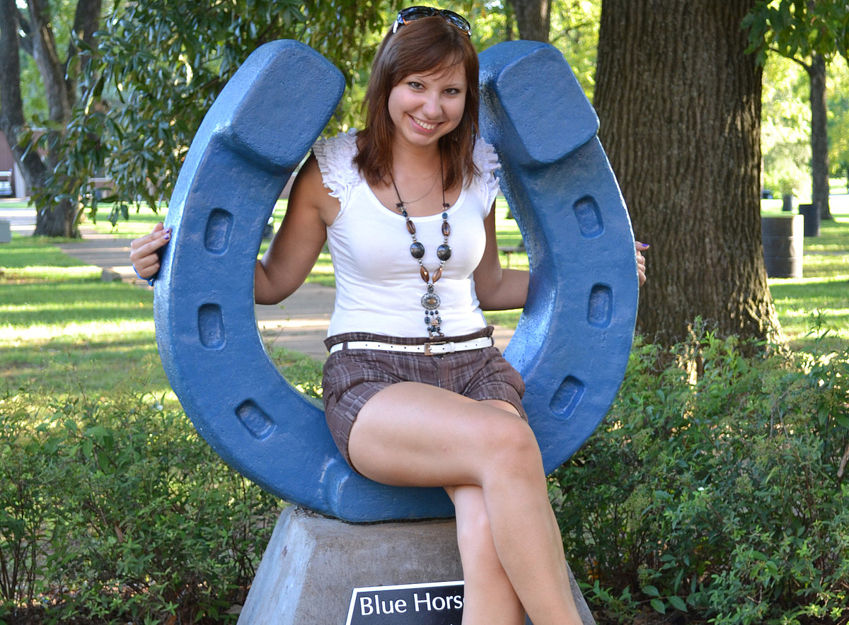 Dina with the Blue Horseshoe, believed to bring good luck, Middle Tennessee State University, the US. The University sports team members, final-year students and others come to touch it before competitions and exams. The photo is taken from personal archive.