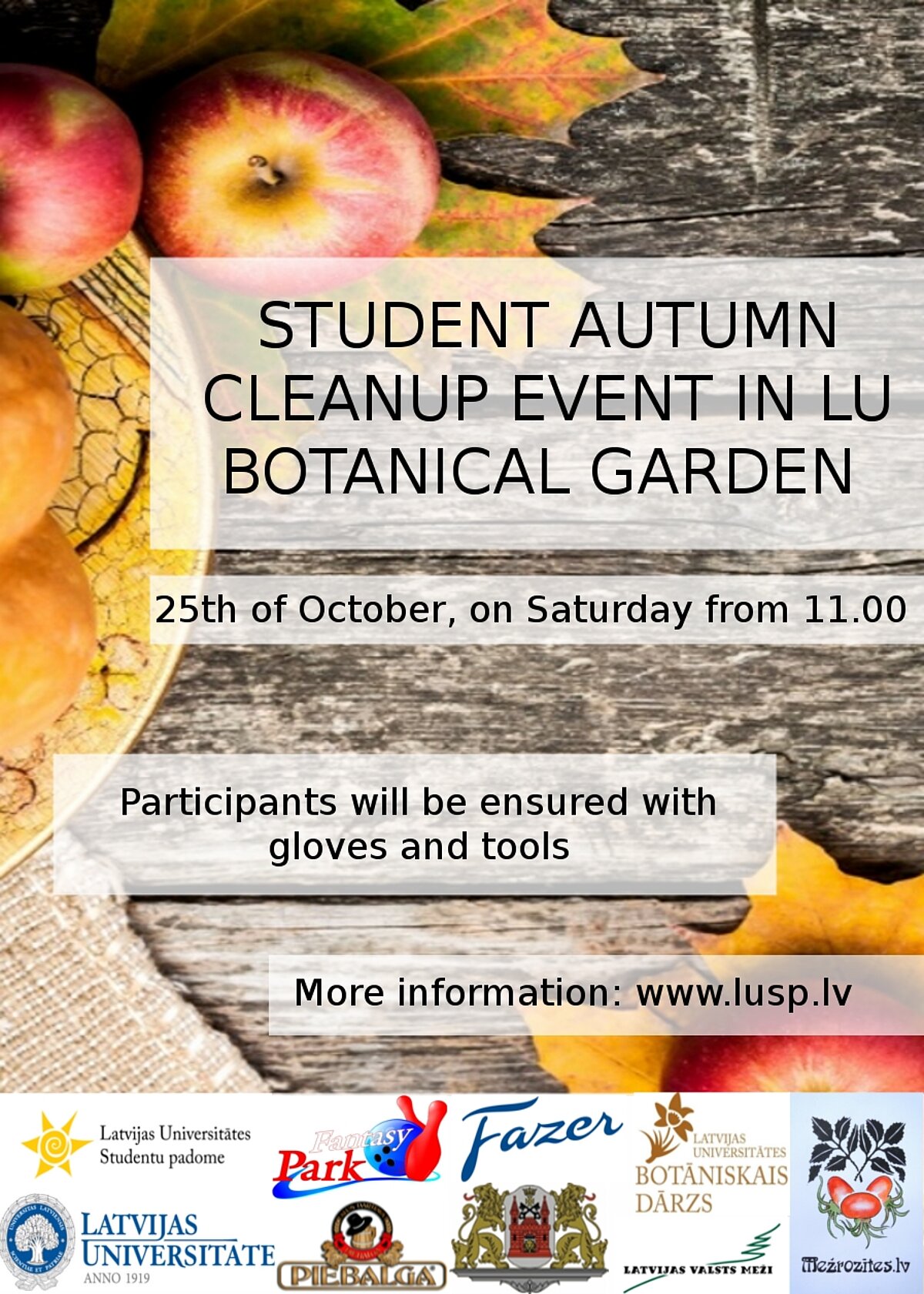 Student autumn cleanup in the Botanical Garden of the University of Latvia is an every year event in Student council calendar. Because of the cleanup event LU Student council invite students, teachers and friends also from other universities and everyone who wants to have a good time working all together and have a picnic after the work. For the first participants there will be warm tee at 10:45, so that until 15:00 we can prepare Botanical garden for the coming winter season, and also just breathe fresh autumn air between the garden exhibitions and spend some good time together with friends. LU Student council for a well done job will treat all participants with tea, malt drink, biscuits and warm soup for lunch.
