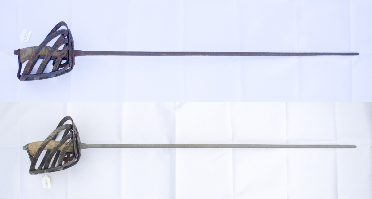 Rapieru saglabātības stāvoklis pirms saglabāšanas darbu veikšanas bija samērā slikts, par to norāda korozijas klātbūtne uz metāla daļām, kas pilnībā klāj rapieru asmeņus un daļēji arī kurvjus (2. - 3. att.). Korozijas neskartās metāla daļas klātas ar melnu eļļas krāsu. Vispirms tika veikta priekšmetu tīrīšana un atputekļošana, lai virsmu atbrīvotu no netīrumu, putekļu un iespēju robežās no baltiem punktveida traipiem. Tā kā rapieri ir heterogēni, t.i. sastāv no dažādiem materiāliem (metāla, koka, ādas un tekstila), lai sekmīgāk veiktu to saglabāšanas darbus, bija nepieciešamība tos maksimāli demontēt. Tas ir ļoti būtiski, jo dažādiem materiāliem ir nepieciešama atšķirīga pieeja to saglabāšanā. Katrs no rapieriem tika demontēts piecās daļās (14. att.).