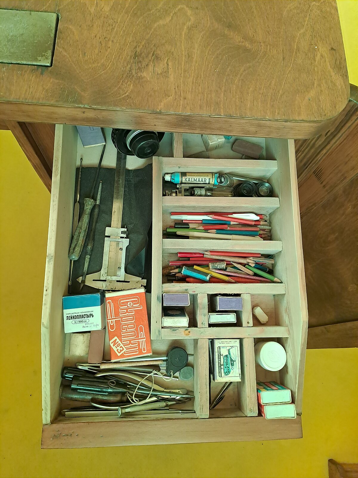 Galda virsmā iestrādāta 10 x 8 x 4 cm tērauda lakta, kas, kā redzams, arī krietni tikusi lietota: tās darba virsma ir stipri saskrambāta. Paleontoloģijā nereti nepieciešama ne pārāk masīvu paraugu sadalīšana, skaldīšana, plēšana, kas tad arī uz šīs laktas ticis darīts. Uz laktas sāniem iecirsti skaitļi “1966.6.12”, kas, iespējams, ir priekšmeta izgatavošanas datums. (Un, starp citu, varētu būt saistīts arī ar V. Grāvīša dzimšanas dienu 14. decembrī.) Arī galda atvilktnēs ir daudzi instrumenti, kas noderīgi nelielu paraugu preparēšanai – kaltiņi, mazs aptiekā pirkts āmurītis, standziņas un knaiblītes, dažāda lieluma īleni, visādi cieta tērauda, šķiet, zobārstniecībai paredzēti instrumenti, dažāda palielinājuma rokas lupas. Arī alumīnija folijas gabaliņi un plastilīns – sadalītā ieža gabala sastāvdaļu atkalsavienošanai vienā gabalā. V. Grāvītis bija pazīstams paleontologs, specializējies uz devona pleckāju (toreiz tos parasti sauca par brahiopodiem) pētniecību.