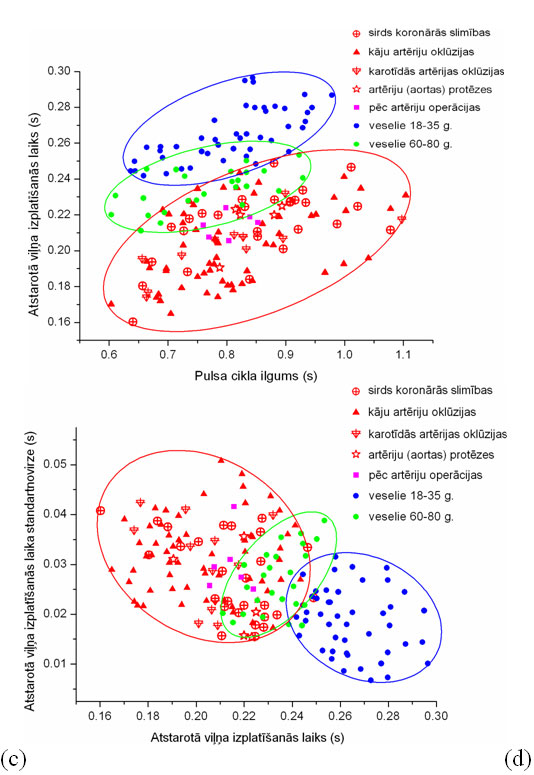 3.attēlā redzami grafiki, kas attēlo korelācijas starp dažādiem asinsrites parametriem un to standartnovirzēm. Grafikos izdalītas trīs pacientu grupas. Ar zilu līniju apvilkta veselo cilvēku grupa no 18-35 g., ar zaļu līniju apvilkta veselo cilvēku grupa no 60-80 g., ar sarkanu līniju apvilkta sirds-asinsrites slimnieku grupa (kurā ietilpst 5 apakšgrupas).
