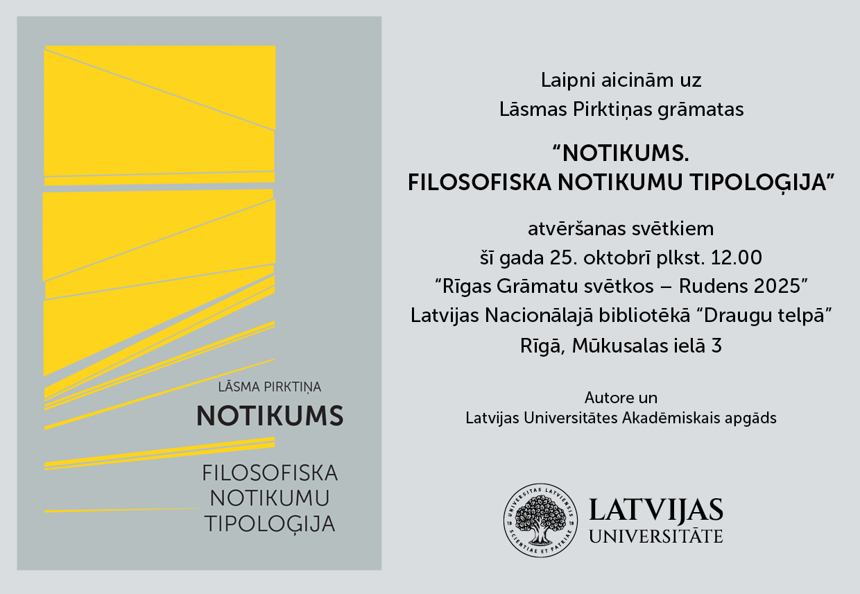 Šī gada 25. oktobrī plkst. 12.00 “Rīgas Grāmatu svētkos – Rudens 2025” Latvijas Nacionālajā bibliotēkā “Draugu telpā” (Rīgā, Mūkusalas ielā 3) notiks Latvijas Universitātes Akadēmiskajā apgādā izdotās Lāsmas Pirktiņas grāmatas “Notikums. Filosofiska notikumu tipoloģija” atvēršanas svētki.