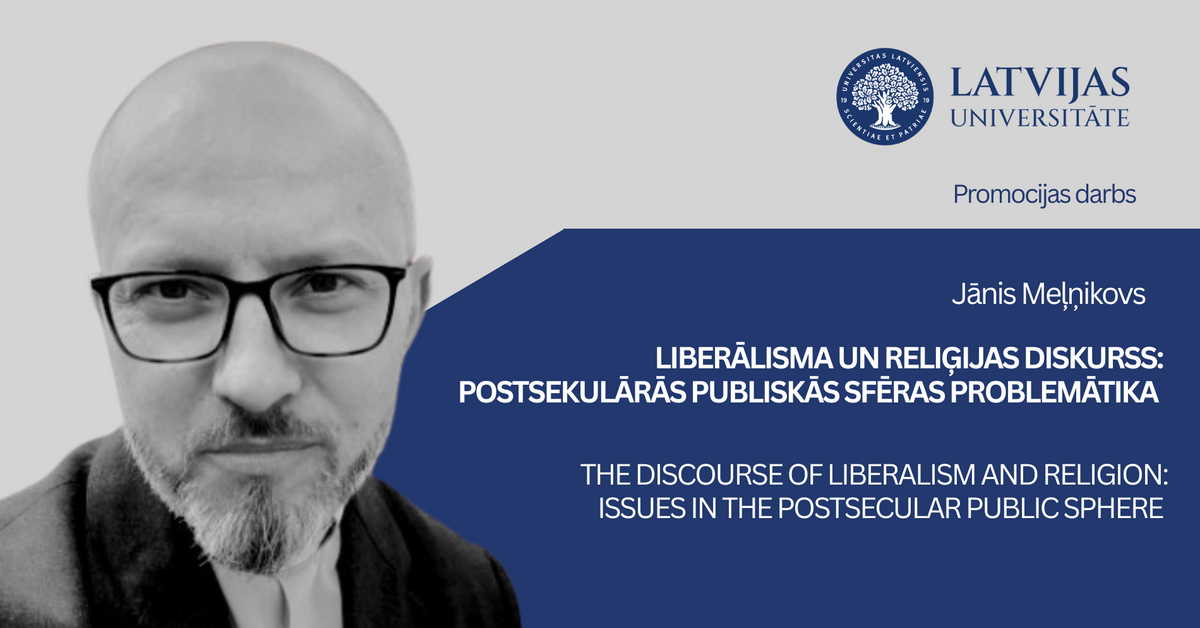 2026. gada 16. aprīlī plkst. 11.00 LU Humanitāro zinātņu fakultātes Filozofijas, ētikas un reliģijas nozares promocijas padomes filozofijā atklātā sēdē attālināti Jānis Meļņikovs aizstāvēs promocijas darbu "Liberālisma un reliģijas diskurss: postsekulārās publiskās sfēras problemātika" zinātnes doktora grāda (Ph.D.) iegūšanai humanitārajās un mākslas zinātnēs.