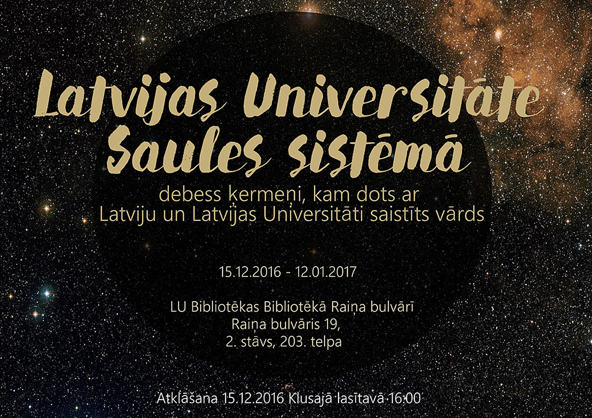 Latvijas Universitātes (LU) Bibliotēkas Bibliotēkā Raiņa bulvārī (Raiņa bulv. 19, 203. telpa) 15. decembrī plkst. 16.00 tiks atklāta izstāde “Latvijas Universitāte Saules sistēmā: debess ķermeņi, kam dots ar Latviju un Latvijas Universitāti saistīts vārds”.