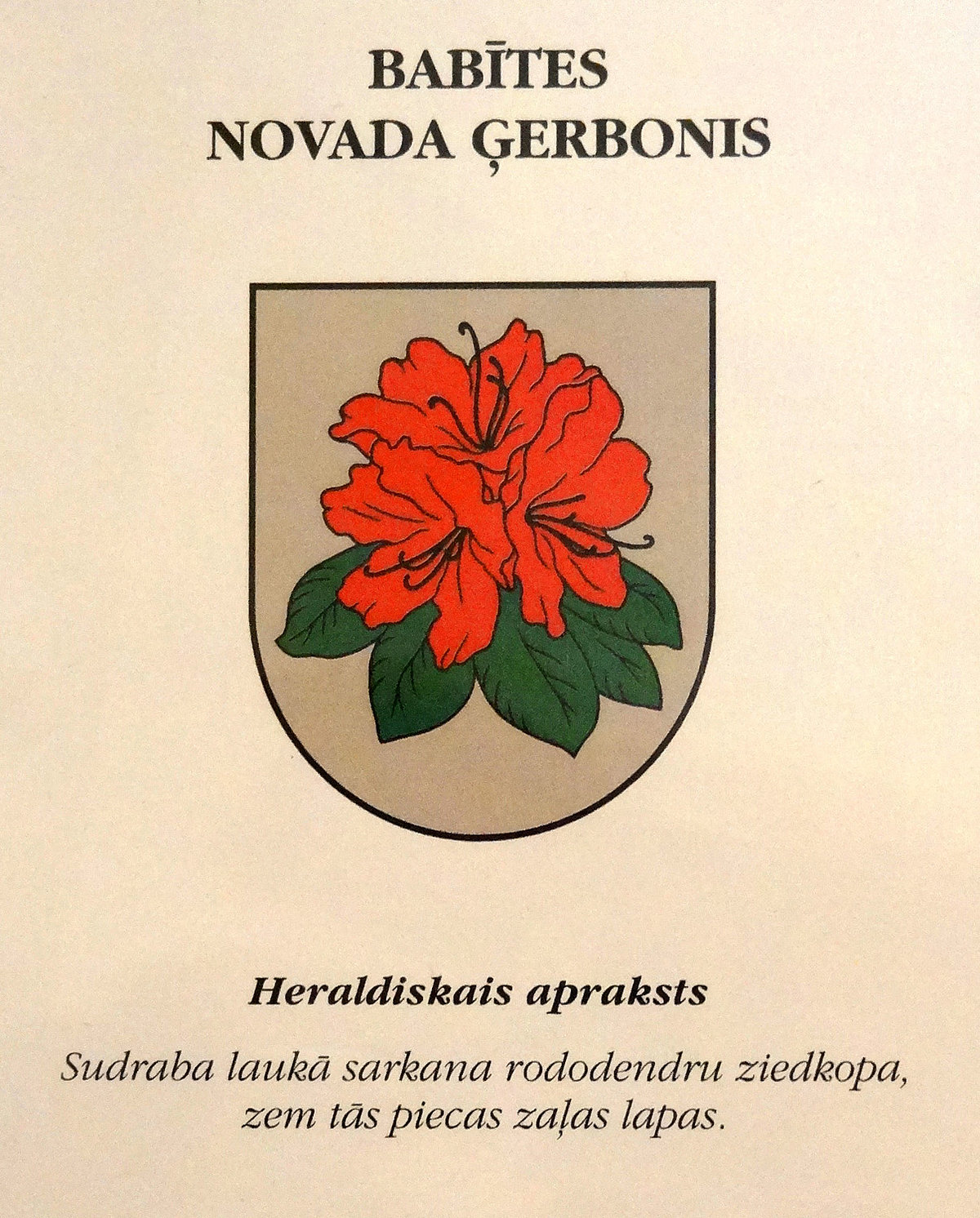 2012. gada 6. septembrī Rīgas pilī Ģerboņu svētkos Valsts prezidents Andris Bērziņš svinīgi pasniedza Babītes novadam jauno novada ģerboni uz kura sudraba laukā attēlota sarkana rododendra ziedkopa. Izvēloties Babītes novadam raksturīgāko simbolu, ko varētu izmantot ģerboņa izstrādē, tika piedāvātas daudzas idejas, bet uz Valsts Heraldikas komisiju pašvaldības dome izvirzīja piecus simbolus: šūpuli, maizi, kliņģeri, lāceni un rododendra ziedkopu. Valsts Heraldikas komisija atzina, ka piemērotākais ir rododendra ziedkopa jo, lai arī rododendrs Latvijā ir samērā eksotisks augs, tieši Babītes novadā atrodas Baltijā vienīgā specializētā rododendru audzētava - Latvijas Universitātes Rododendru selekcijas un izmēģinājumu audzētava „Babīte”. Pateicoties audzētavas zinātnieku un dārznieku pūlēm, rododendra zieds ir kļuvis pietiekami atpazīstams. Audzētavas ekspozīcijās aug 74 savvaļas rododendru sugas un vairāk kā 200 šķirnes, tai skaitā arī 69 šķirnes, kas izveidotas audzētavā tās 32 gadu pastāvēšanas laikā. Vairākas jaunās šķirnes pasaulē nes Babītes vārdu, piemēram, mūžzaļie rododendri: ‘Babītes Baltais’, ‘Babītes Sarkanais’, ‘Babītes Kompaktais’; vasarzaļie: ‘Babītes Alīna’, ‘Babītes Anita’, Babītes Astra’, ‘Babītes Indra’, ‘Babītes Inga’ u.c. Ar rododendru izcilo krāšņumu katru gadu ziedēšanas laikā (aprīlī, maijā un jūnijā) audzētavā iepazīstas vairāk kā 15000 apmeklētāju ne vien no Latvijas, bet arī ārvalstīm. Stādu tirdzniecības laikā - rudenī un pavasarī interesenti var iegādāties 90 līdz 100 dažādu rododendru sugu un šķirņu stādus.