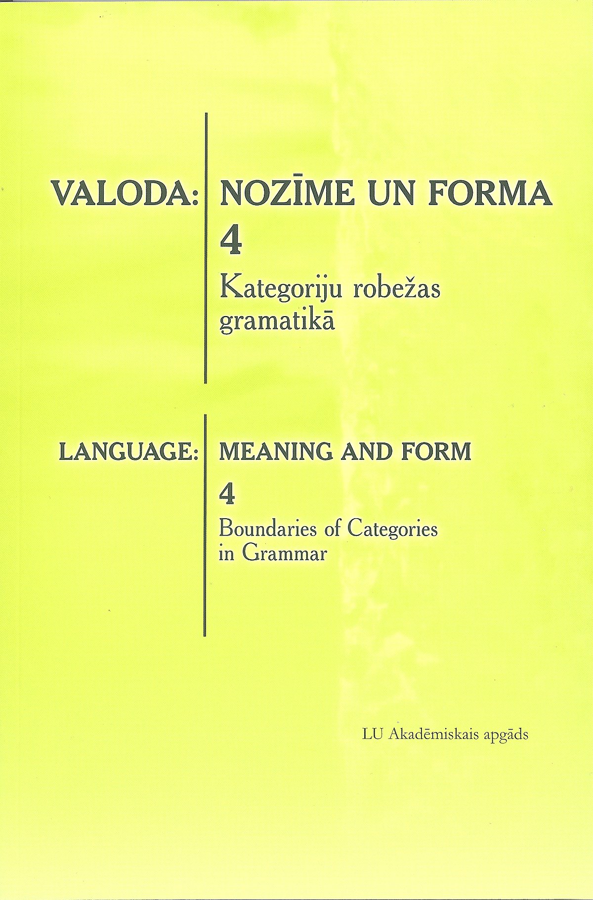 Krājumā „Valoda: nozīme un forma. 4. Kategoriju robežas gramatikā” ietilpst piecpadsmit rakstu, jo LU 71. konferences Latviešu un vispārīgās valodniecības katedras sekcijas ziņojumus papildina arī divi atsevišķi tapuši pētījumu. Rakstu autori ir gan LU Humanitāro zinātņu fakultātes docētāji (Ilze Lokmane „Verbāls sastata izteicējs latviešu valodā”, Andra Kalnača „Darbības vārda veids un modalitāte”, Inta Urbanoviča „Deminutīvu darināšana un lietvārdu deklinācijas”, Līga Ciematniece „Teikuma struktūra un pārejamība”, Baiba Ivulāne „Darbības vārda morfoloģiskās un sintaktiskās palīgnozīmes robežas”, Ojārs Lāms un Mārtiņš Laizāns („Aristoteļa Runas mākslas (Rētorikas) latviskošanas pieredze – sengrieķu substantivējumu tulkošana”)) un doktoranti vai jaunie zinātnieki (Evelīna Zilgalve „Vārdu pāra ja – tad funkcionālā analīze”, Tatjana Kuzņecova („Regulārie vārddarināšanas procesi: starp vārddarināšanu un formveidošanu”)), gan Liepājas Universitātes valodniece Linda Lauze („Kategoriju robežu noteikšanas problēmas mutvārdu tekstā”), gan LU Latviešu valodas institūta (Anita Butāne („Vārddarināšanas kalku paveidi un to norobežošanas kritēriji”), Ieva Kuplā („Kompleksa pieeja daudznozīmīga verba semantiskās struktūras analīzē”)) un LU Matemātikas un informātikas institūta (Ilze Auziņa, Gunta Nešpore, Baiba Saulīte ar kopīgu pētījumu „Latviešu valodas verbu valences marķēšanā izmantojamās semantiskās lomas”) pētnieki.