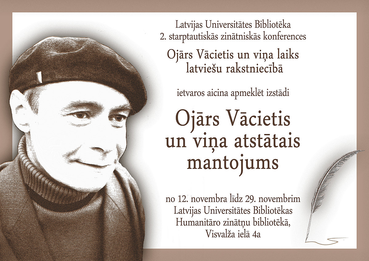 Izstādē ”Ojārs Vācietis un viņa atstātais mantojums” Latvijas Universitātes Bibliotēkas Humanitāro zinātņu bibliotēkā Visvalža ielā 4a no 12. līdz 29. novembrim būs iespēja iepazīties ar O. Vācieša  devumu latviešu literatūrā. Būs aplūkojami viņa dzejas un prozas darbi, varēs iepazīt  O.Vācieti arī kā tulkotāju. Pie viņa pazīstamākajiem tulkojumiem minams Bulgakova romāns „Meistars un Margarita”. Izstāde veidota  2.ās starptautiskās konferences Ojārs Vācietis un viņa laiks latviešu rakstniecībā ietvaros. Mākslas augstskolas rīt lems par neuzticības izteikšanu IZM ministram Robertam Ķīlim.