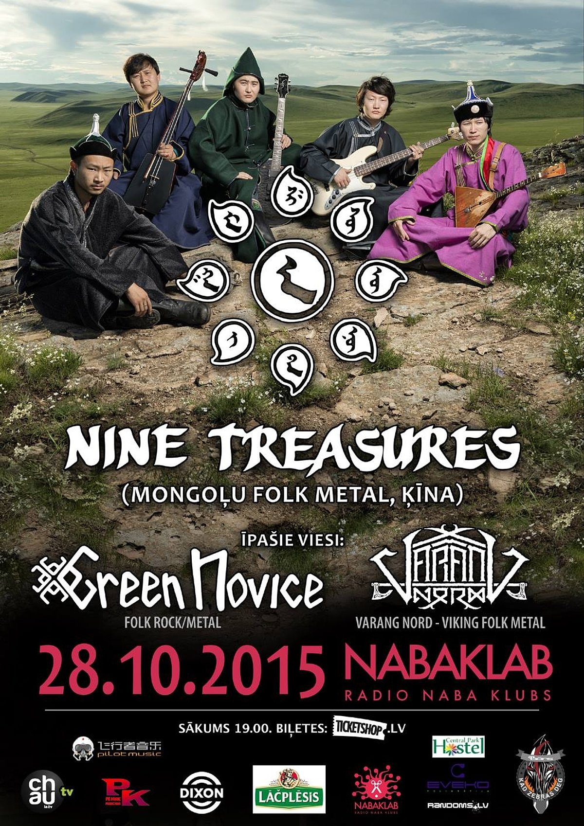 Nine Treasures - folk-metal grupa, kas nāk no Ķīnas ziemeļiem un kuras mūziķi ir etniskie mongoļi. Grupas dalībnieki izauga skarbos, plašos un, tajā pašā laikā, gleznainos apstākļos un kopš bērnības uzsūca sevī apkārtējo kultūru un vēsturi. Visi dziesmu teksti ir rakstīti mongoļu valodā. Pirmo reizi mūziķi sanāca kopā Pekinā 2010. gada nogalē, un 2012. gada maijā izdeva savu debijas albumu «Arvan Ald Guulin Honshoor» . Pēc uzvaras Wacken Metal Battle konkursa nacionālajā atlasē savā valstī, 2013. gada vasarā Nine Treasures piedalījās konkursa starptautiskajā finālā Vācijā Wacken Open Air festivālā un ieguva otro vietu no 28 valstīm. Neiegūstot galveno balvu - kontraktu ar ierakstu kompāniju Nuclear Blast - grupa nenolaida rokas, jo ieguva milzīgu pieredzi un ticību saviem spēkiem. Atgriežoties mājās grupa izdeva mini albumu un īsā laikā noorganizēja trīs koncertu tūres Ķīnā. Šogad Nine Treasures atgriežas Eiropā ar vairākiem koncertiem tostarp arī Latvijā.