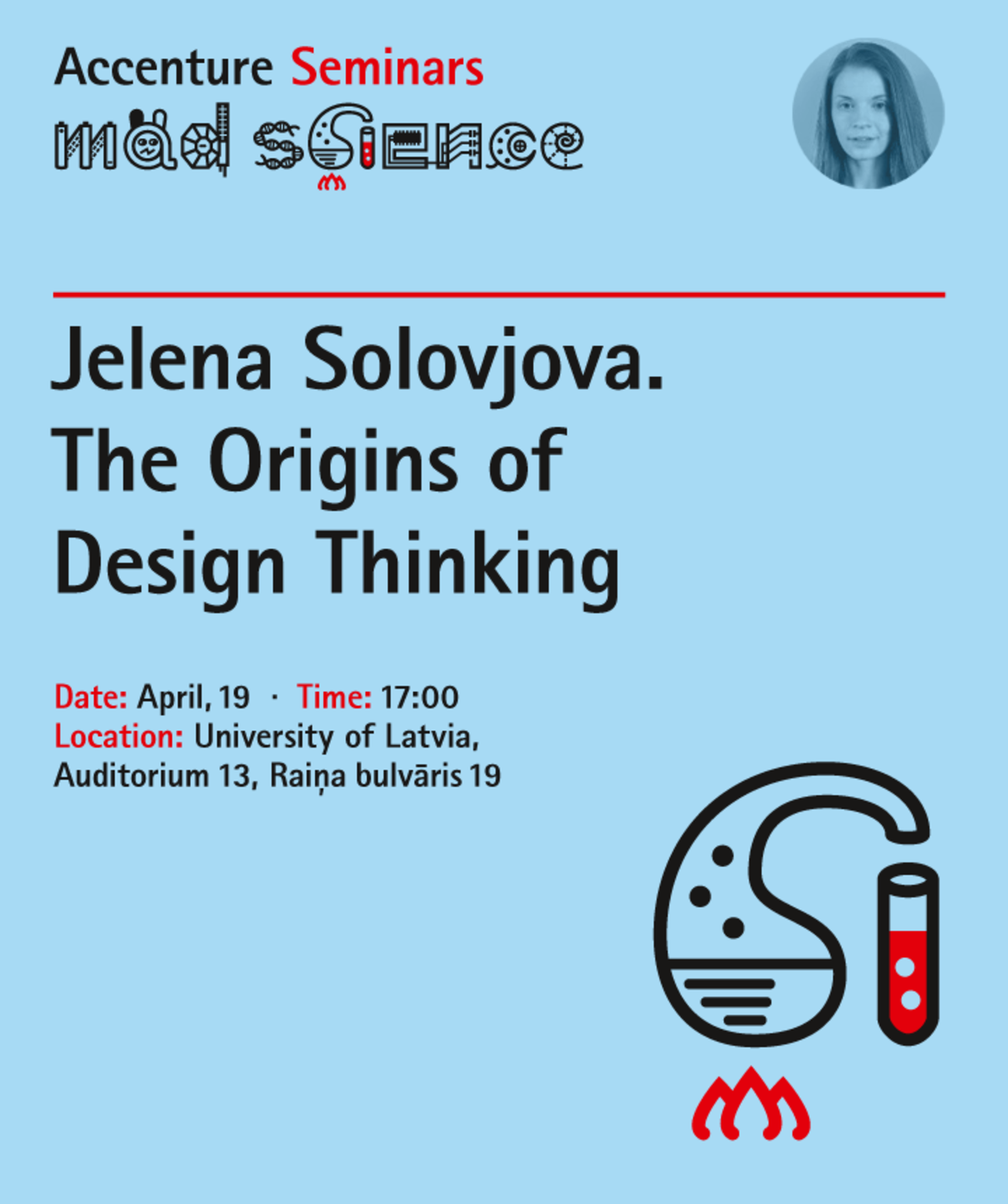Accenture sadarbībā ar LU Datorikas fakultātes Alumni asociāciju aicina uz "Mad science" lekciju cikla pasākumu, kas notiks 19. aprīlī plkst. 17:00, Latvijas Universitātē, Raiņa bulvārī 19, 13. auditorijā. Ar lekciju uzstāsies lektore, žurnāliste un dizaina kritiķe Jeļena Solovjova. Lekcijas tēma: “Ievads dizaina domāšanā”.