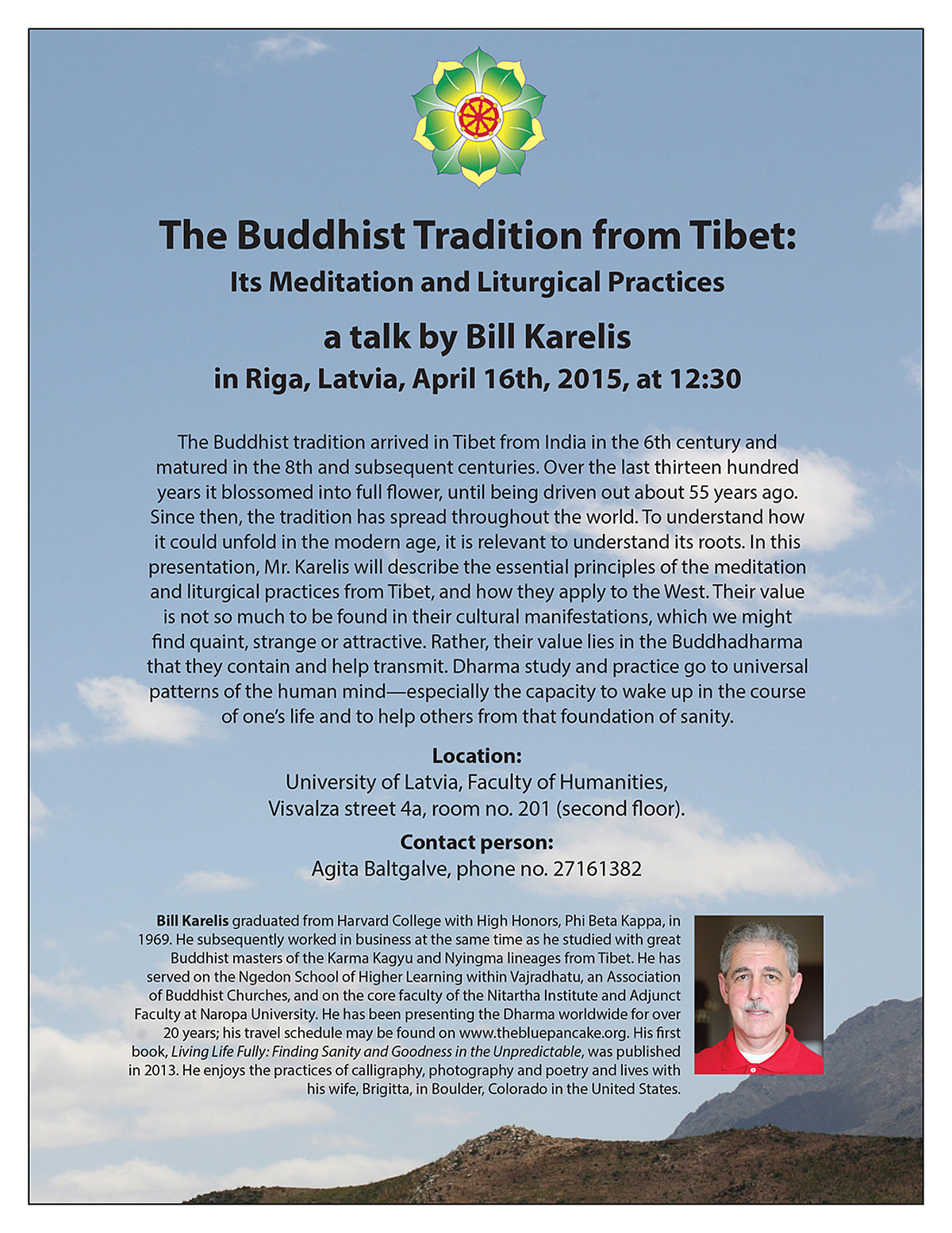 Ceturtdien, 16.aprīlī plkst. 12.30, 205. telpā notiks amerikāņu budisma pētnieka Bila Karela vieslekcija "The Buddhist Tradition from Tibet" (Tibetas budisma tradīcijas).