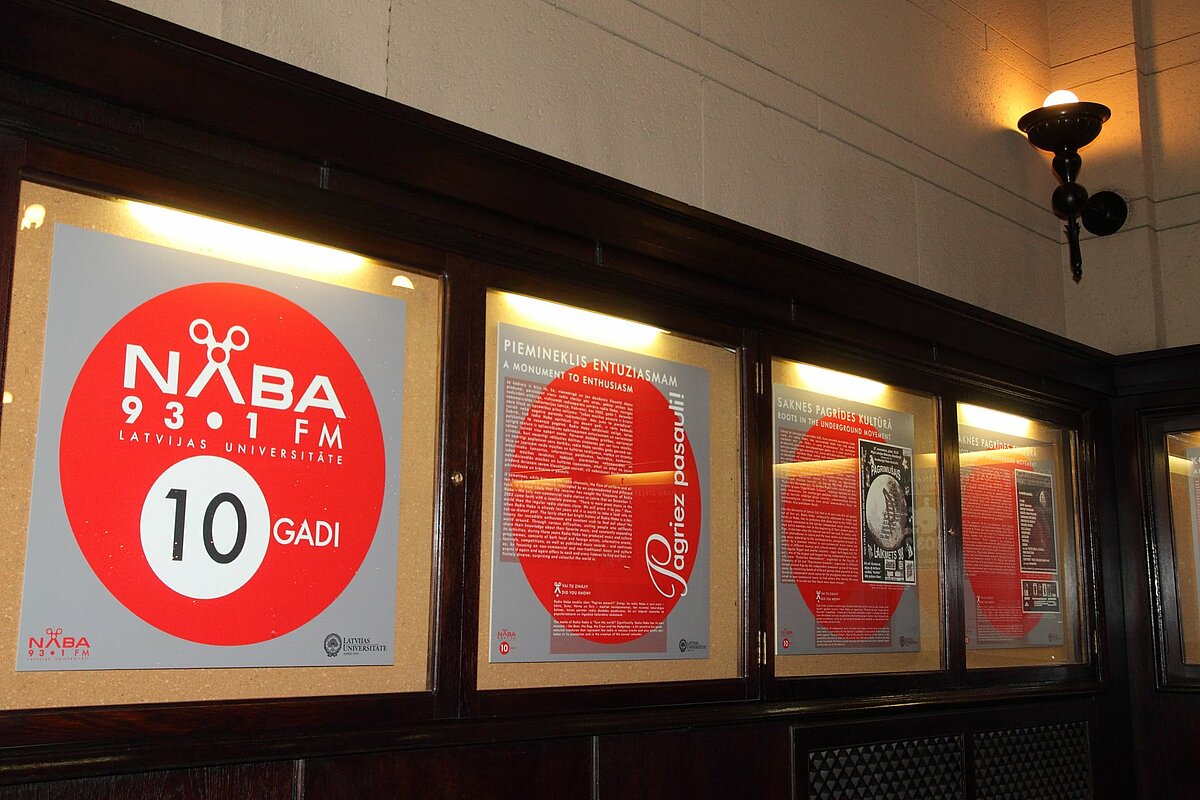 Radio NABA 10 concludes the celebration events; the exhibition displays information in Latvian and English about the only non-commercial radio station’s beginnings, development and major events in the past 10 years. Radio NABA was founded with the support of the UL and Latvian Radio as the 5th broadcasting station of Latvian Radio. It can be heard within the range of 93.1 FM frequencies in the city of Riga and its vicinity. The fairly short but bright history of Radio NABA is a testimony of incredible enthusiasm and constant wish to learn about the world. Despite some difficulties, it was able to unite people who were willing to share their music preferences and was constantly developing. During all these years Radio NABA has been producing music and culture programmes, arranged concerts of local and foreign performers, informative events, festivals, competitions, as well as published music records, focusing on non-commercial and non-traditional music and culture events.