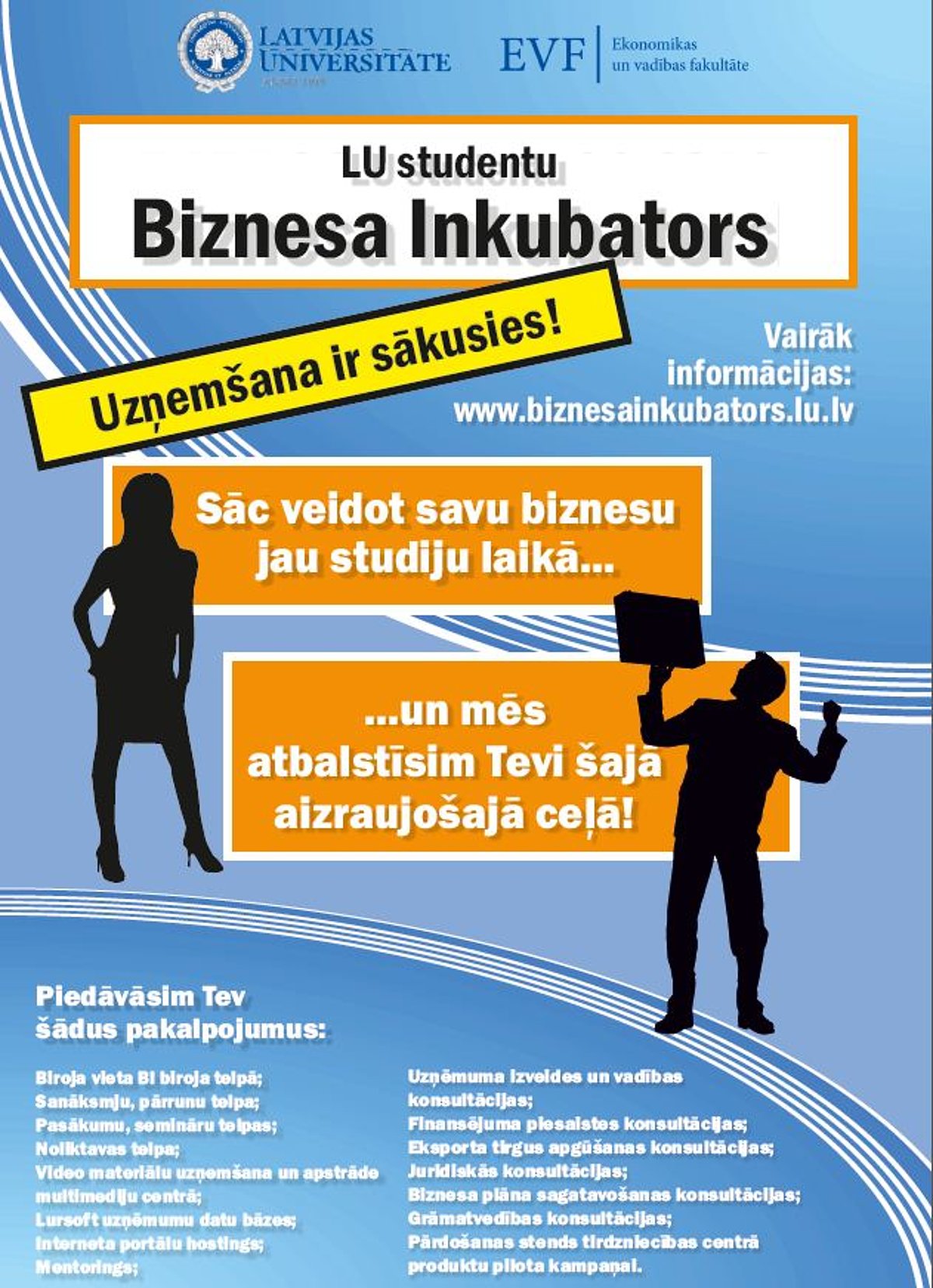 Biznesa inkubators ir LU Ekonomikas un vadības fakultātes struktūrvienība, ko EVF ir izveidojusi, lai atbalstītu ieinteresētos LU studentus uzņēmējdarbības uzsākšanā un attīstībā ar dažādiem atbalsta pakalpojumiem. Lai iestātos biznesa inkubatorā studentam vai studentu grupai ir jāizpilda un jāiesniedz Biznesa idejas pieteikuma veidlapa līdz šī gada 5.oktobrim. Konkursa kārtībā pēc noteiktiem kvalitatīviem kritērijiem tiks uzņemti līdz 10 Biznesa inkubatora dalībnieki, kam būs iespējas saņemt šādus bezmaksas atbalsta pakalpojumus: