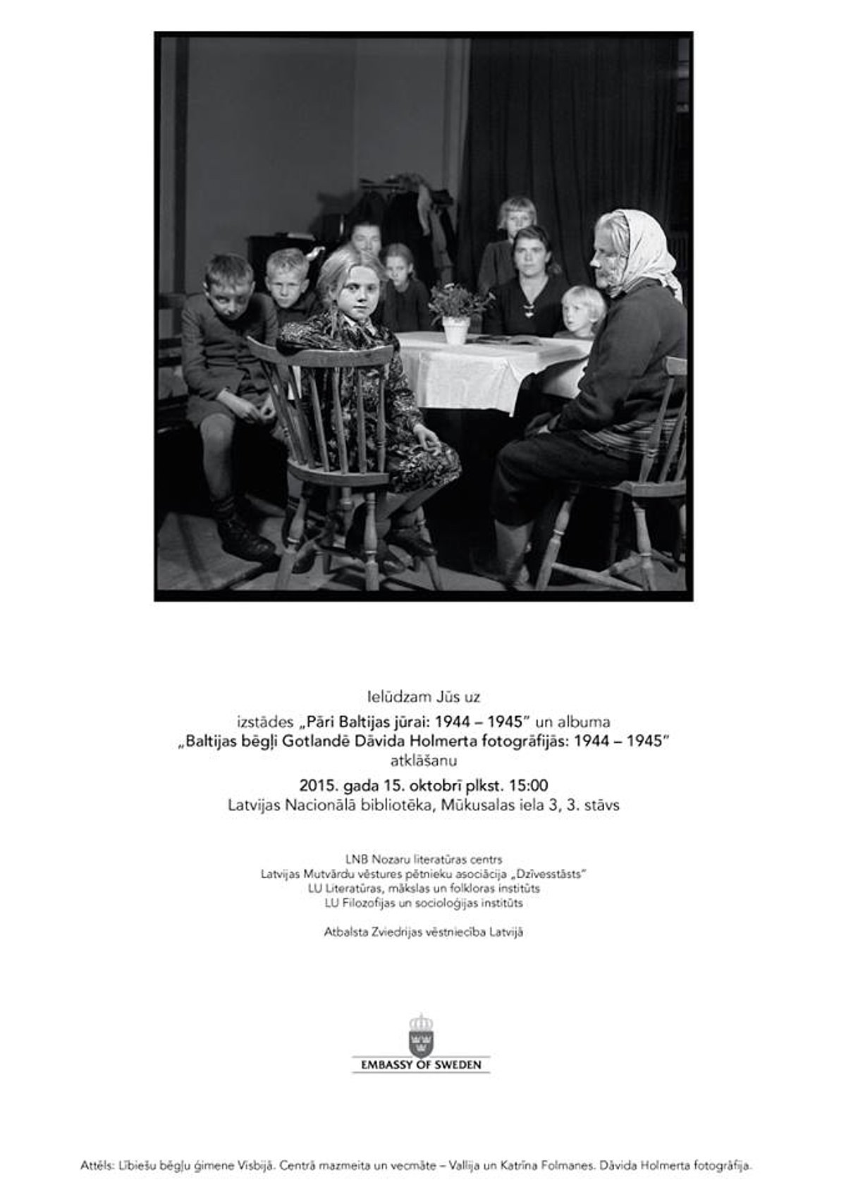 Plkst. 15:00 Latvijas Nacionālajā bibliotēkā, Mūkusalas ielā 3, Rīgā. Pasākums paredzēts 3. stāvā līdzās izstādes „Pāri Baltijas jūrai: 1944–1945” atklāšanai.