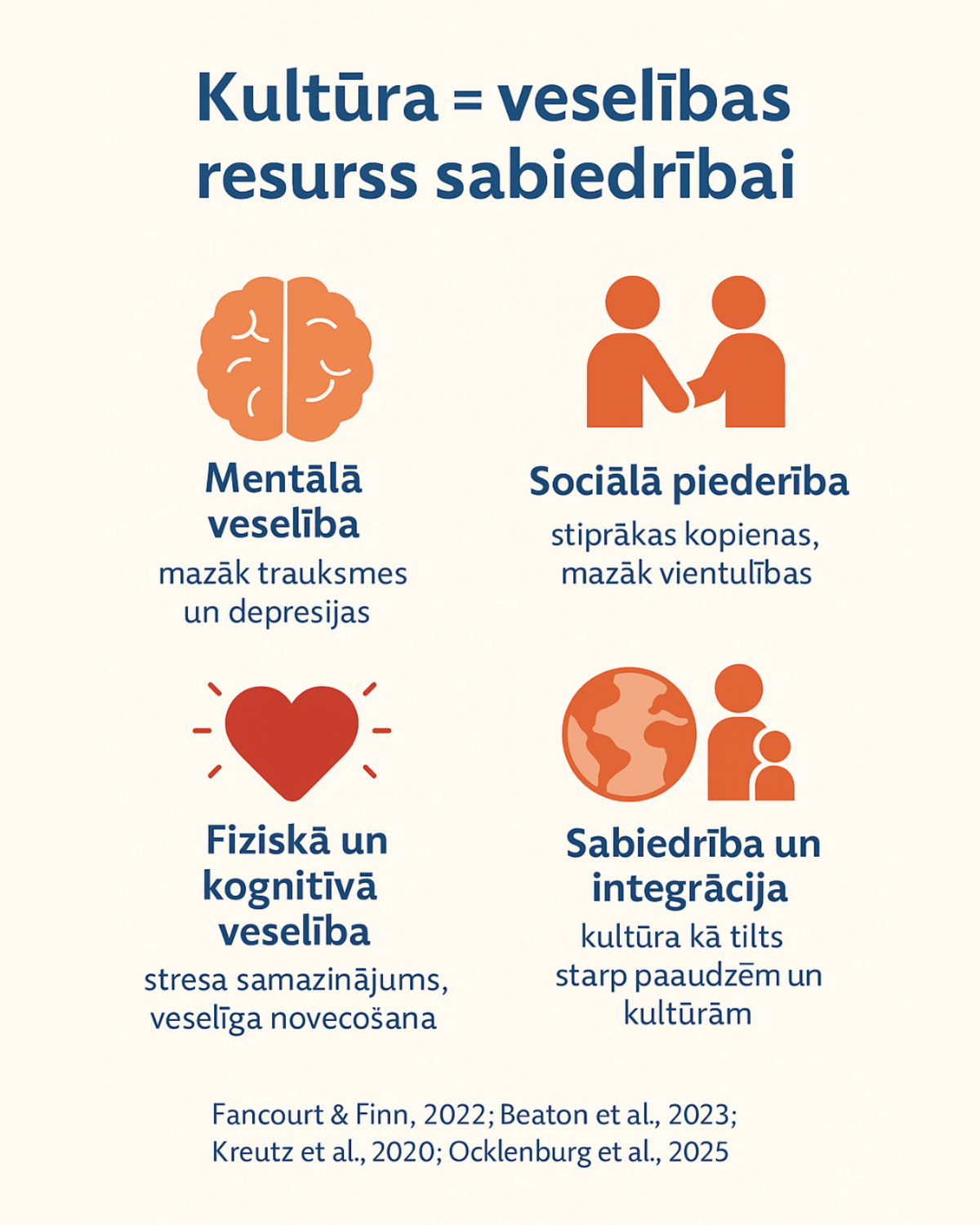Ir labi zināms, ka māksla iedvesmo, vieno un bagātina cilvēka iekšējo pasauli. Taču pēdējo gadu laikā arvien pieaug zinātniski pierādījumi, kas apliecina – kultūras līdzdalība sniedz būtisku ieguldījumu sabiedrības veselībā un labbūtībā. Regulāra iesaiste mākslinieciskās un radošās aktivitātēs uzlabo mentālo veselību, psiholoģisko noturību un sociālo saliedētību, radot mērāmu efektu gan individuālā, gan kopienas līmenī.   Dziedāšana korī, dejošana, teātra spēle, muzicēšana vai amatniecības prakse – visas šīs darbības darbojas kā holistiskas veselības veicināšanas formas, kas vienlaikus stiprina ķermeni, prātu un sociālo saikni.