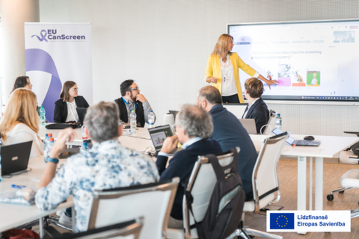 Konferences telpā notiek EU CanScreen projekta sanāksme: cilvēki sēž pie galda ar klēpjdatoriem, bet sieviete pie ekrāna prezentē informāciju. Attēla labajā apakšējā stūrī redzams Eiropas Savienības līdzfinansējuma logotips