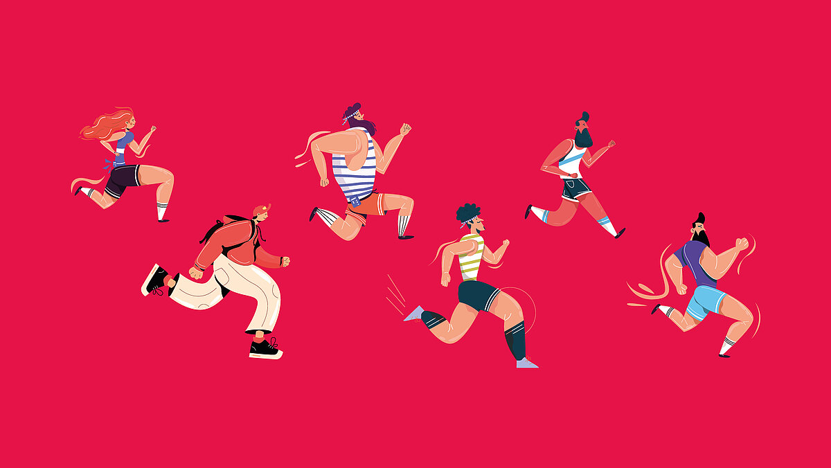 Stilizēti skrējēji kustībā uz spilgti sarkana fona.