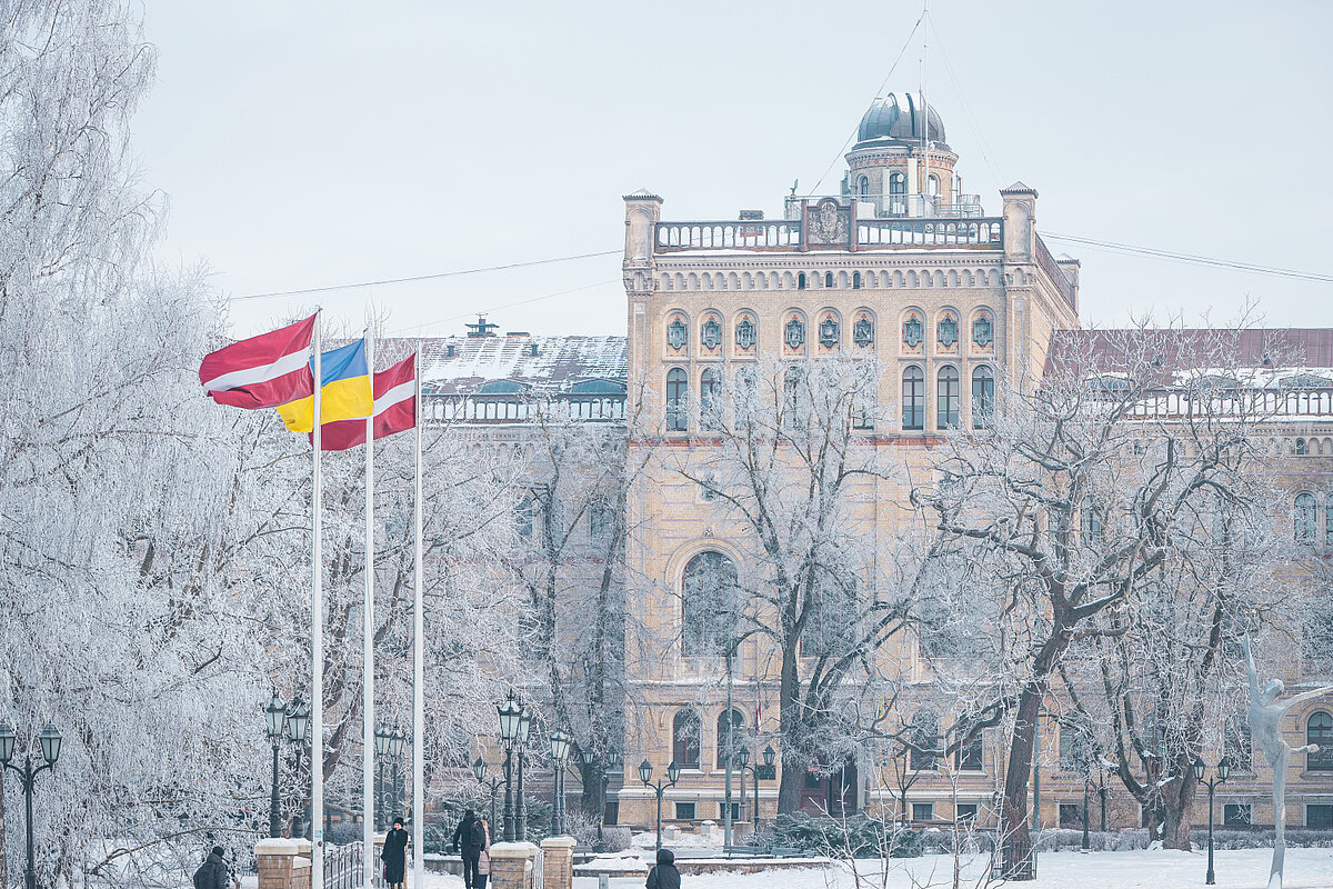 Latvijas Universitātes ēka Raiņa bulvārī 19 ziemā. Apkārt ļoti skaisti apsniguši koki.