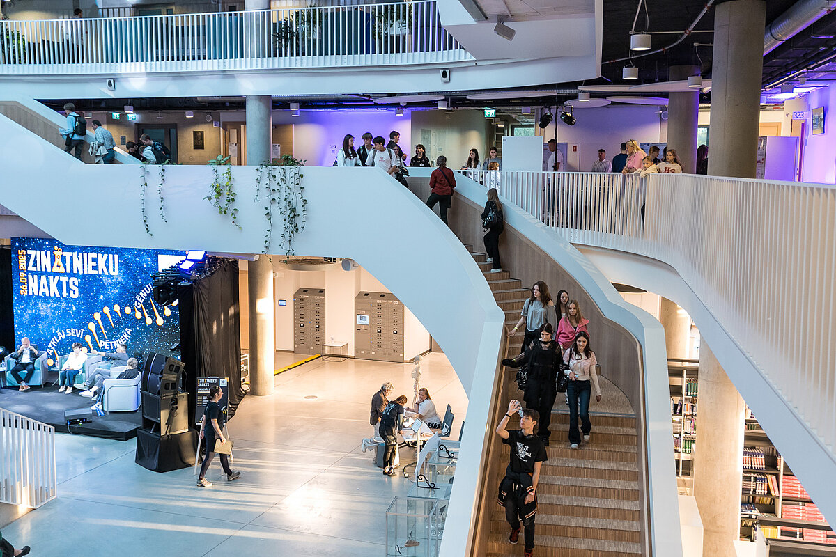 LU Zinātņu mājas ātrijs ar daudz cilvēkiem