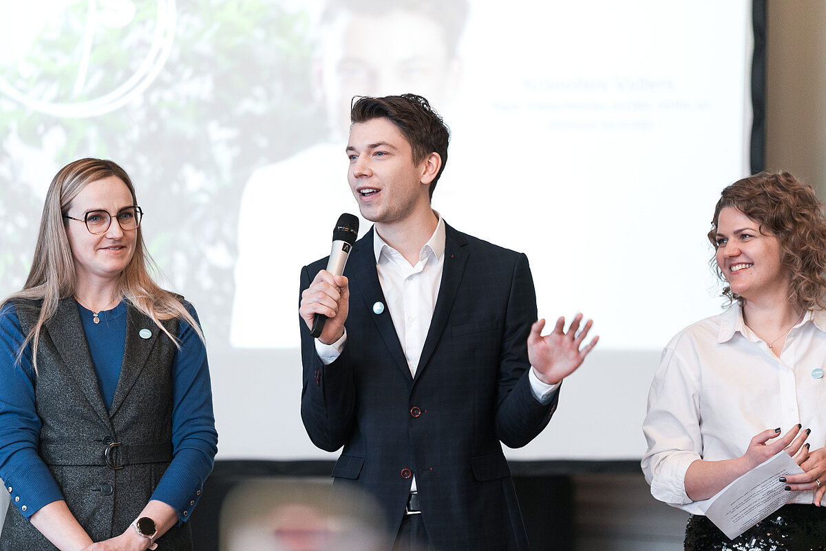 Jaunie skolotāji (3 cilvēki), vienam rokā mikrofons, fonā prezentācija